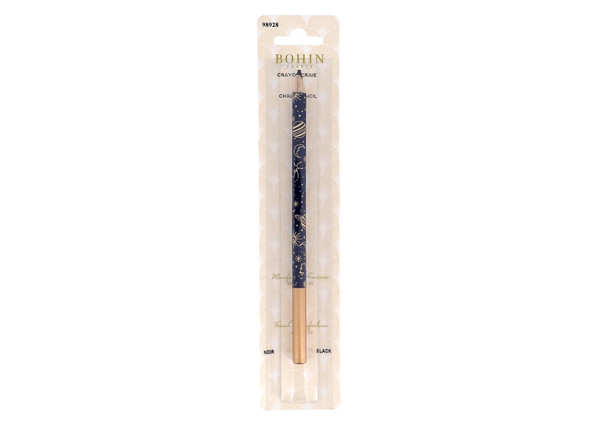 "A marking pencil is an indispensable accessory for drawing pattern lines and marking, buttonholes, pockets and pleats, for instance. The beautiful design of a dark-blue sky with golden stars and planets gives the Bohin marking pencil Room of Wonders a luxurious look. The pencil is very easy and accurate to use and less fragile than ordinary tailor's chalk, making it easier to store and carry with you. The pencil can be sharpened with a normal pencil sharpener."