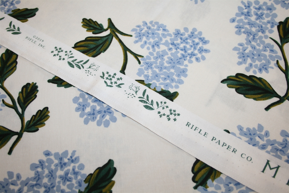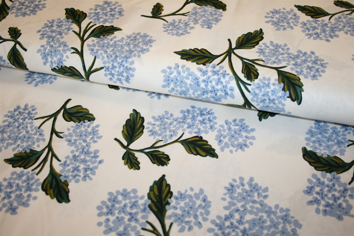 100% bomuld fra Cotton + Steel med blå hortensia blomster på en flødefarvet bund.