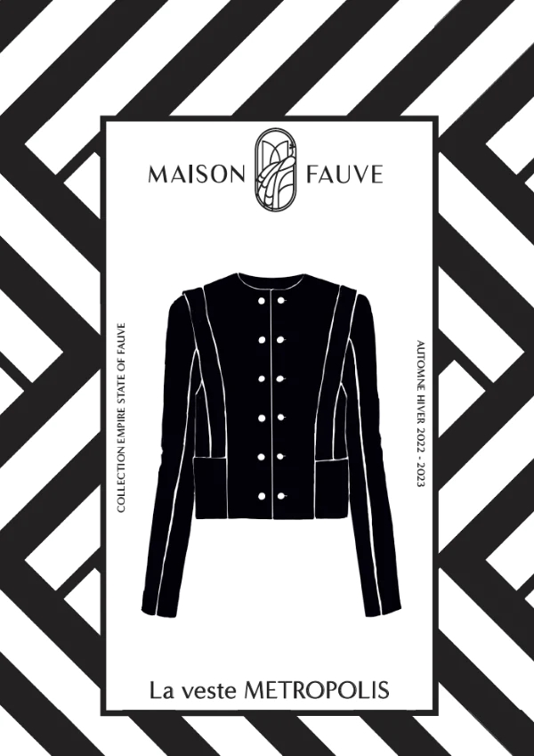 "This very elegant jacket does not fall into classicism: a set of double buttoning in trompe l'oeil, construction lines that structure the cut and judiciously hide pockets and THE Fauve detail of the beautiful METROPOLIS that will definitely sign the model: a set of bands that highlights the cuts.
