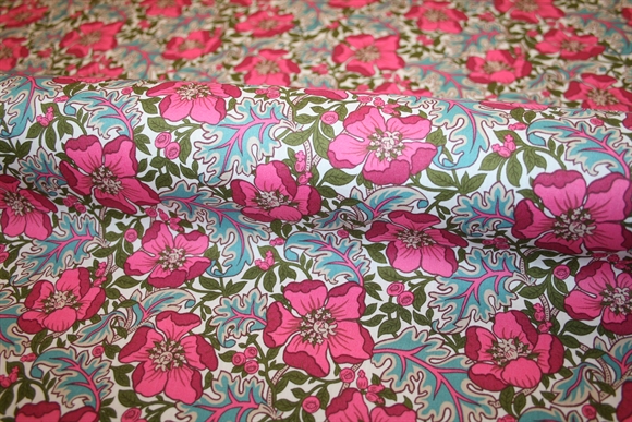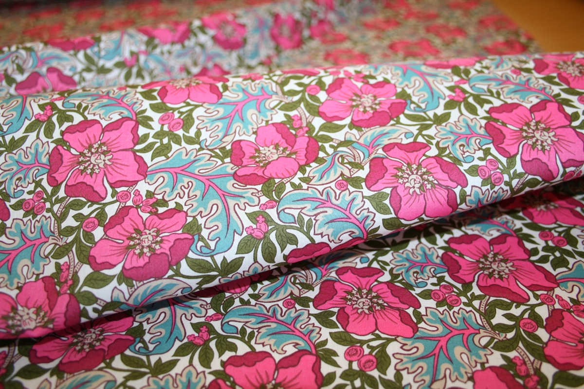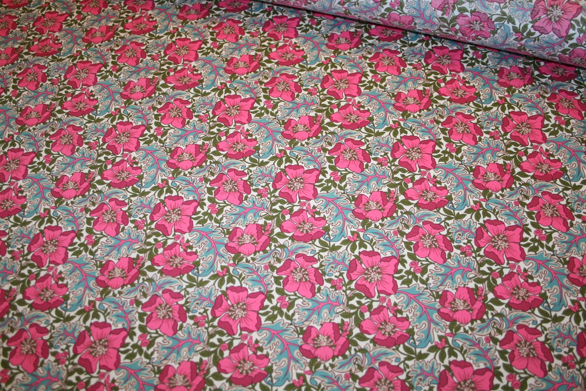 Liberty Tana Lawn™ i 100% bomuld med et klassisk print der er baseret på et håndmalet værk fra arkivet og blomstrer i et botanisk motiv med stiliserede valmuer i pink, bær og snoede blade i et levende, detaljeret udtryk. Stoffet er oeko-tex certificeret, dvs. uden skadelig kemi.