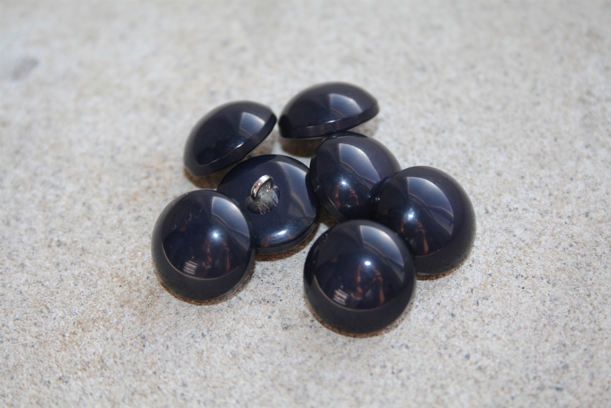 Navy halvkugleformet knap på 15 mm. til striktrøjer, (skjorte)bluser og kjoler. Knappen vejer kun 4,54 gram. Knappen er lavet i slidstærk polyester og tåler skånsom maskinvask.