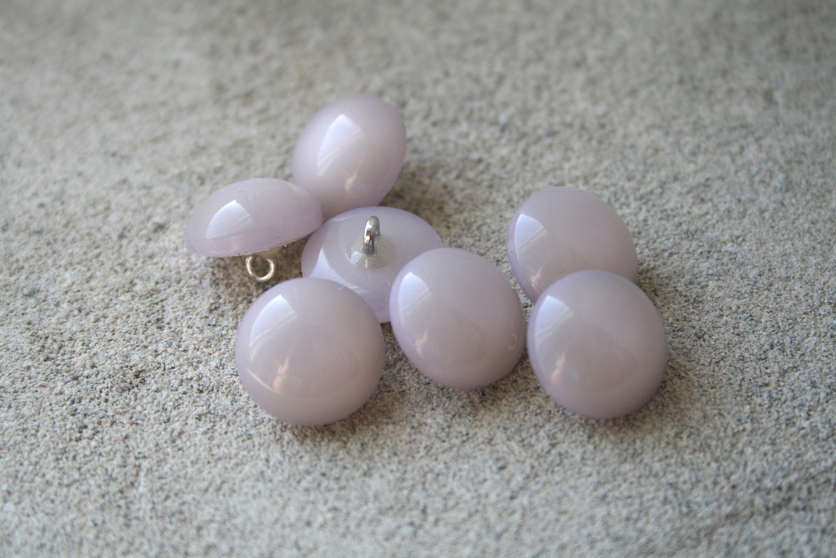 Lyselilla halvkugleformet knap på 15 mm. til striktrøjer, (skjorte)bluser og kjoler. Knappen vejer kun 4,54 gram. Knappen er lavet i slidstærk polyester og tåler skånsom maskinvask.