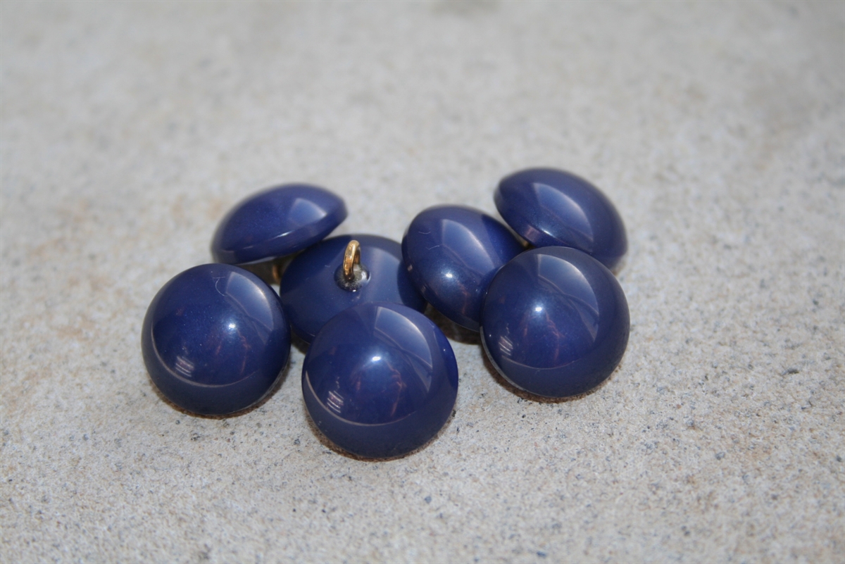 Marineblå halvkugleformet knap på 15 mm. til striktrøjer, (skjorte)bluser og kjoler. Knappen vejer kun 4,54 gram. Knappen er lavet i slidstærk polyester og tåler skånsom maskinvask.