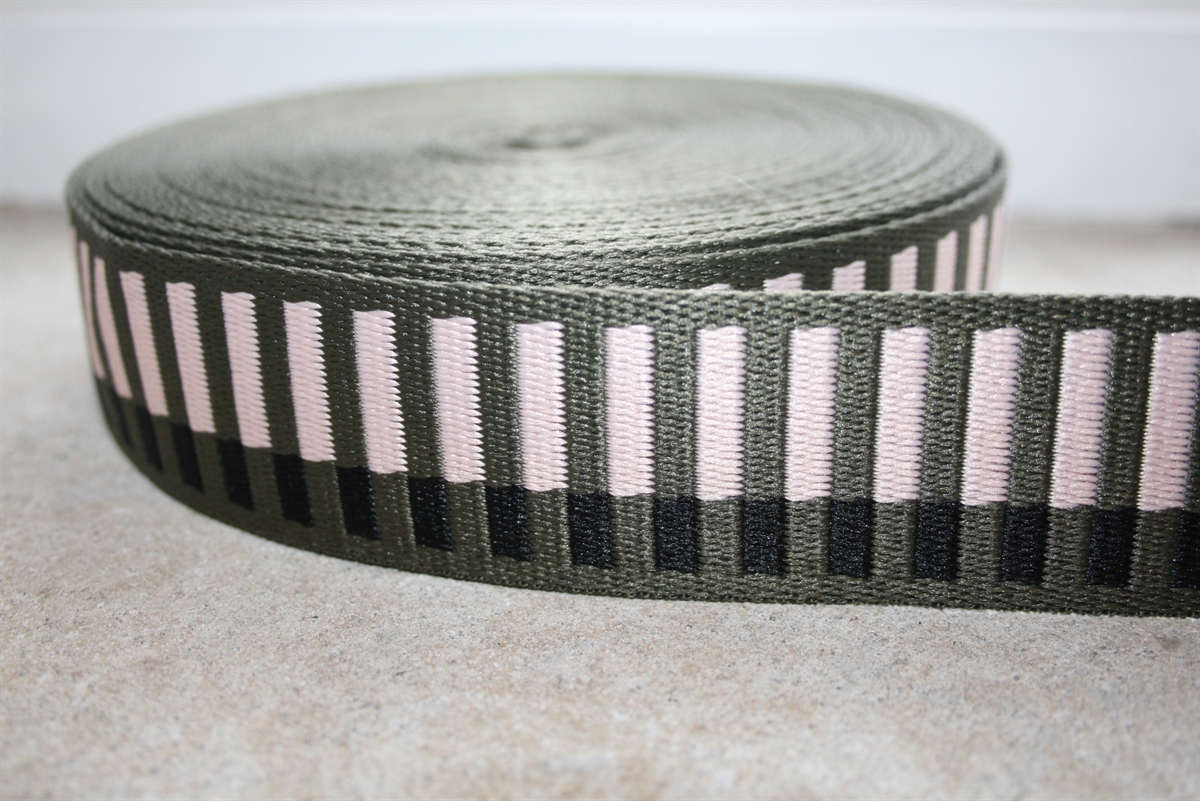 Gjordbånd med lyserøde/sorte striber på en mosgrøn bund. Båndet er 38 mm bredt og er meget velegnet til taskestropper.