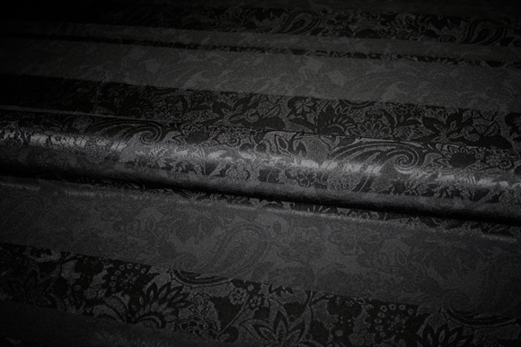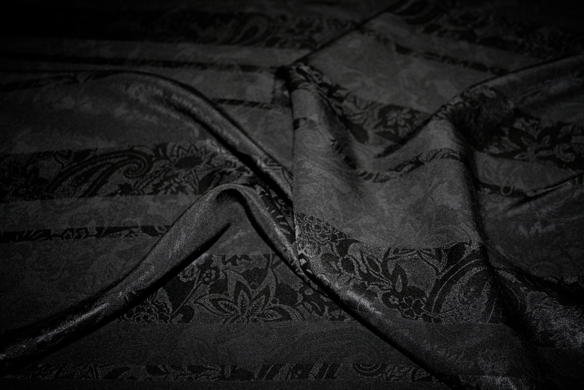 Eksklusiv jacquardvævet sort silke med paisley og blomster i vandrette striber af varierende bredde. Stoffet er skiftesvis blankt og mat. Stoffet er produceret for Etro.