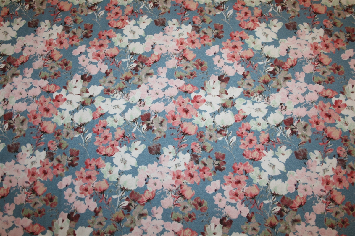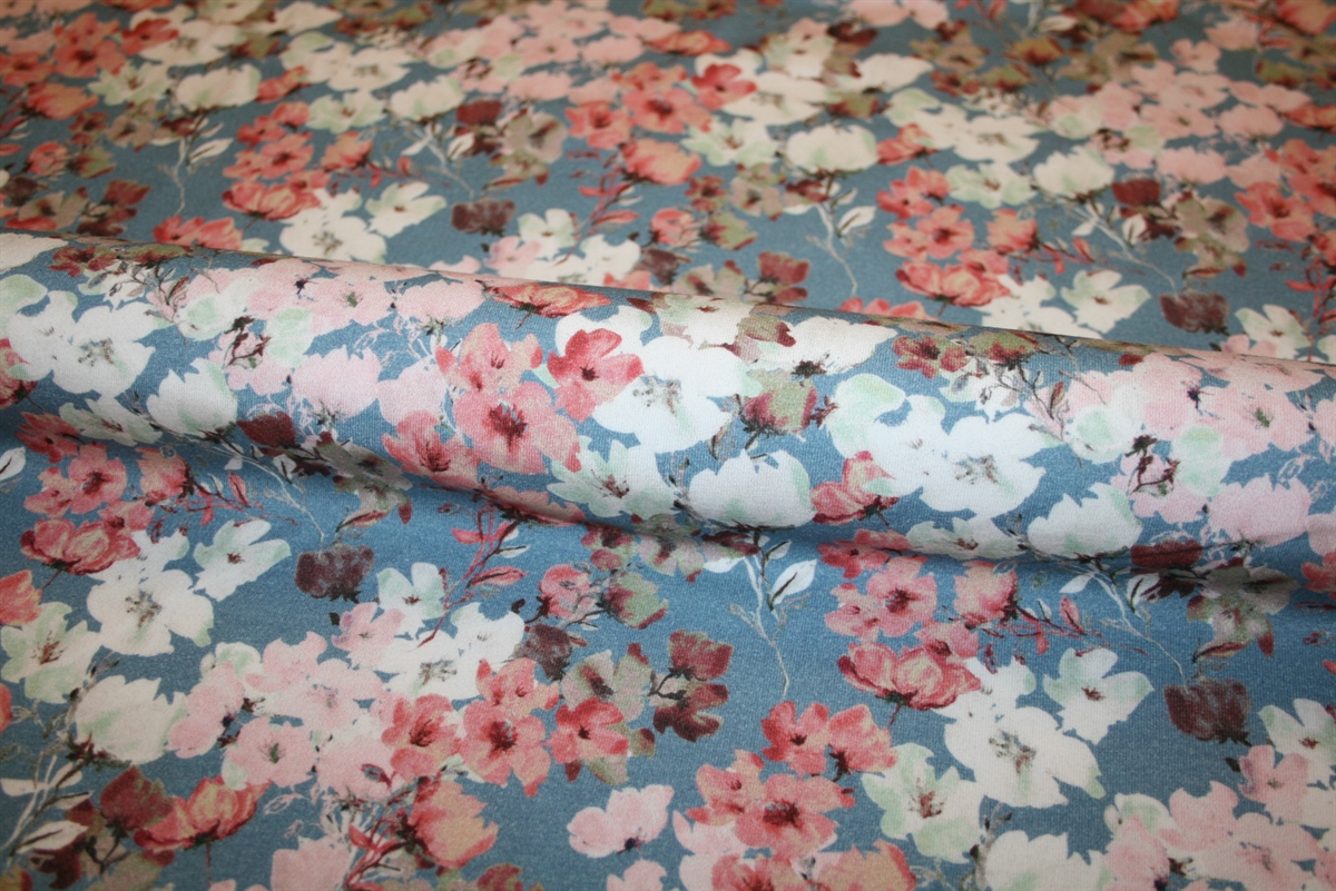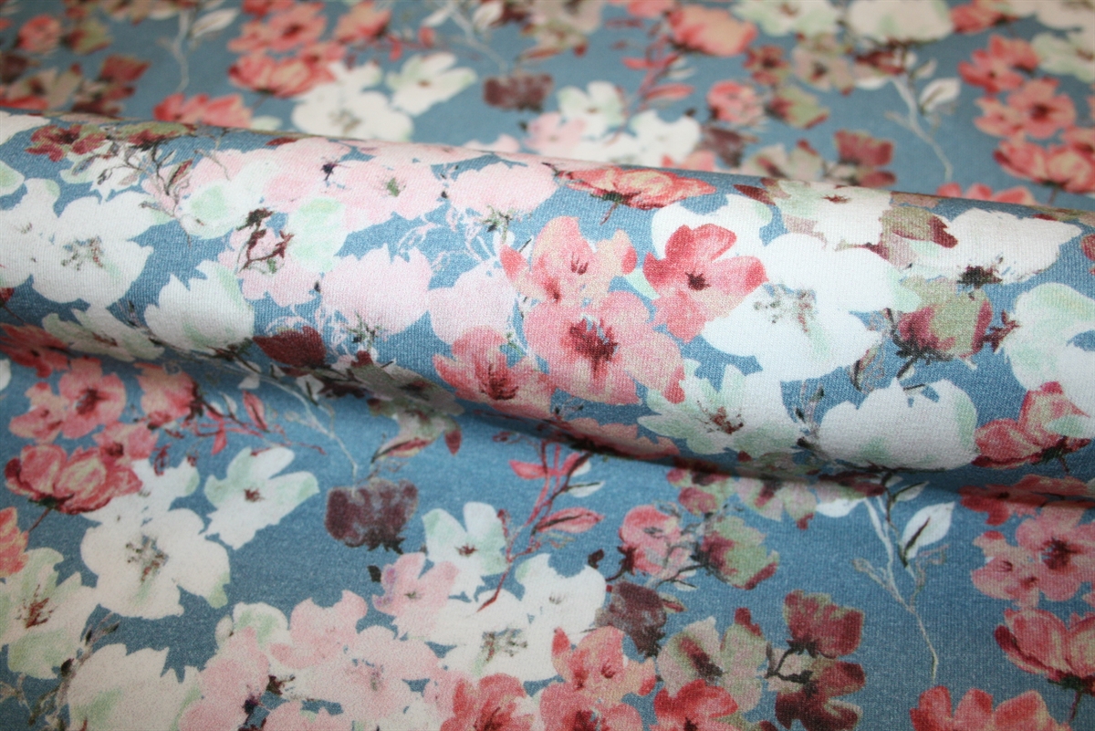 Blød bomuldsjersey med blomster på en støvet blå bund.