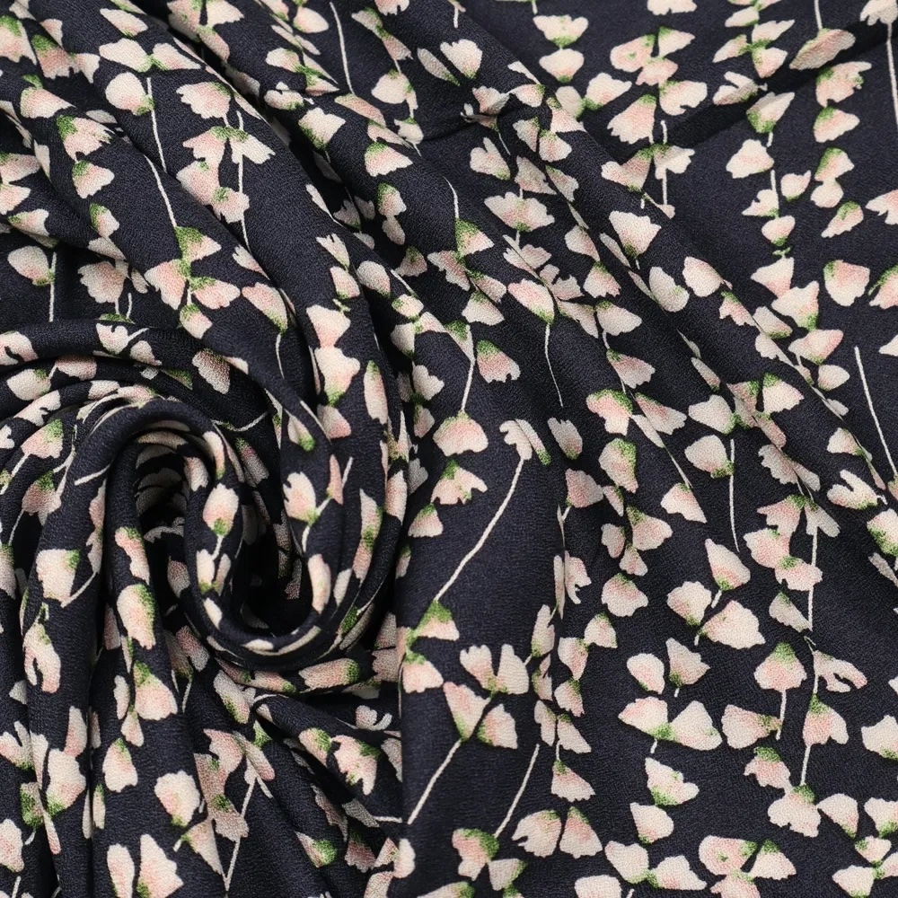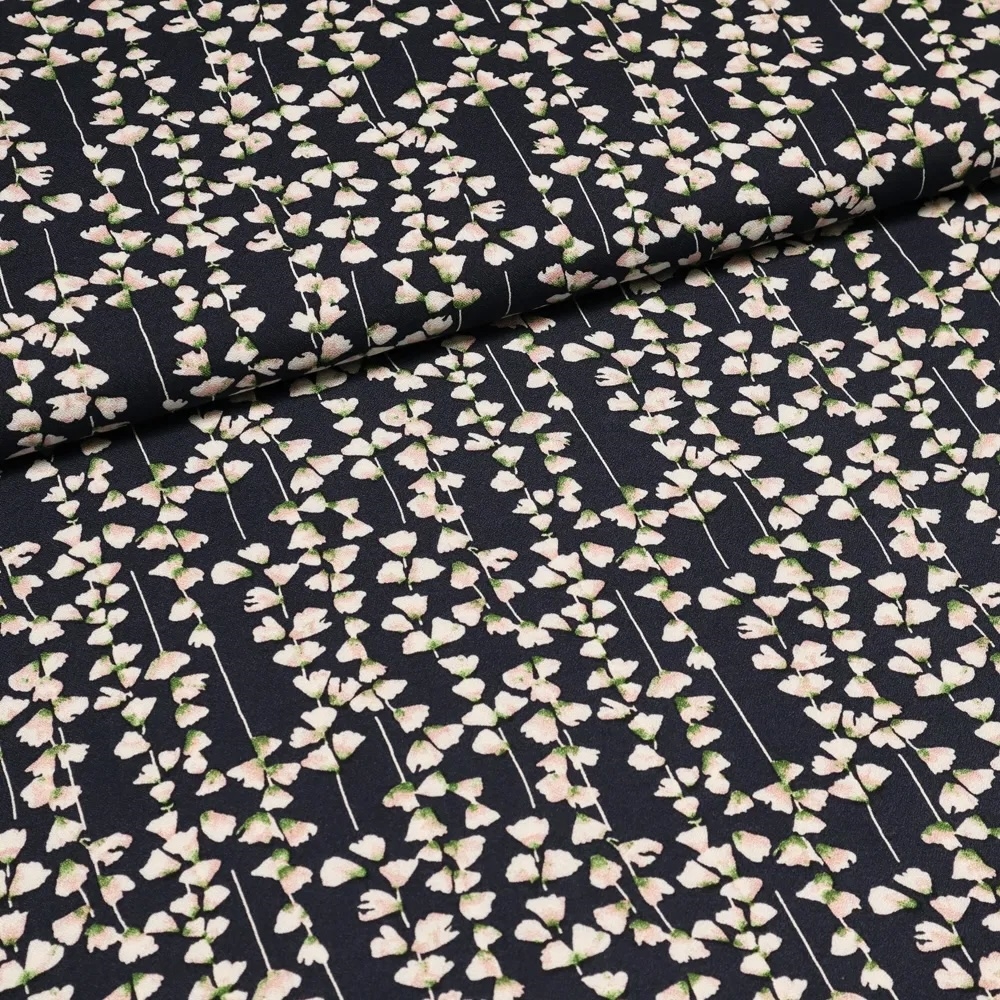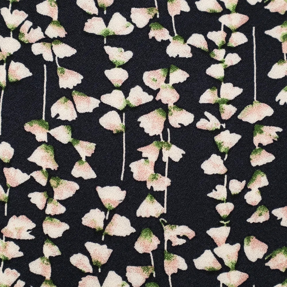 Blomstret viskose crepe i navy med rosa, hvide og grønne nuancer.