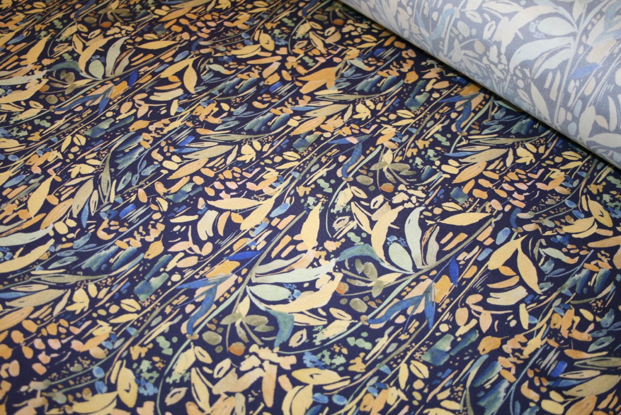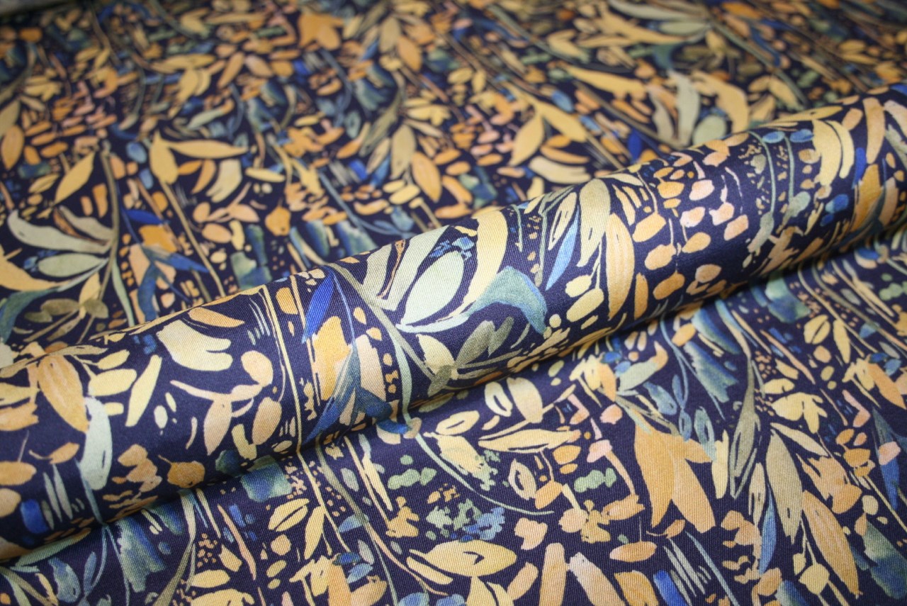 Diagonalvævet viscose med print i rolige toner på en mørkeblå bund. Lækker italiensk kvalitet uden stræk.