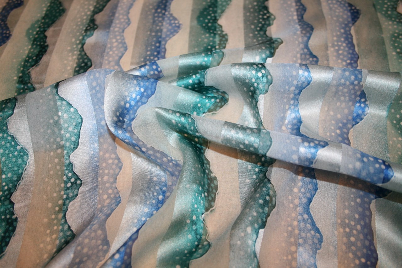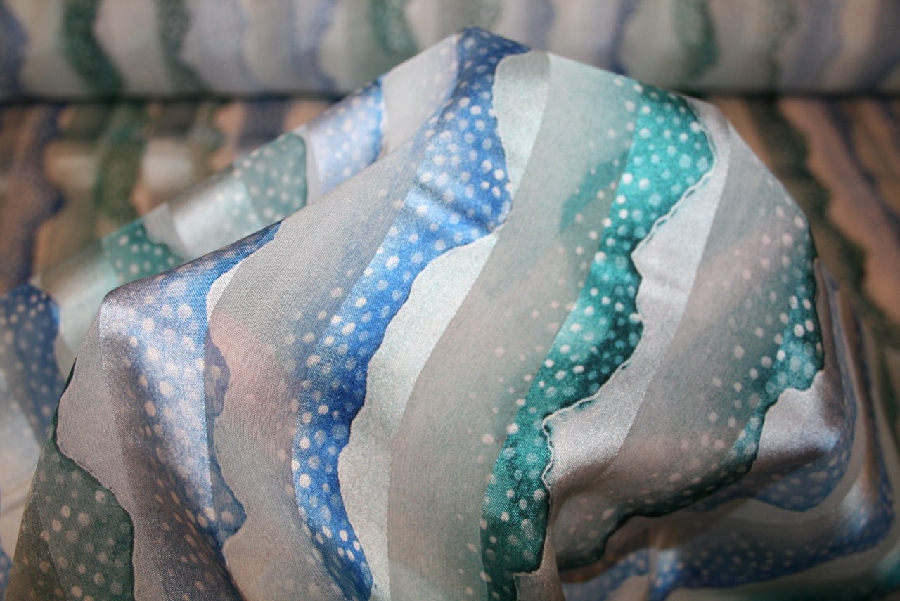Satinvævet viscose med sommerligt print i bølgende former. Kvaliteten er let og blød og falder naturligt ind til kroppen.