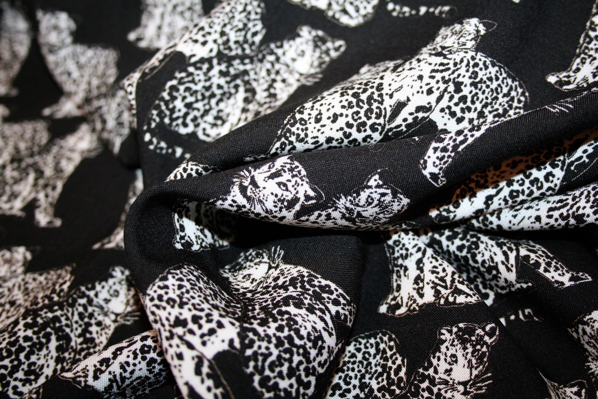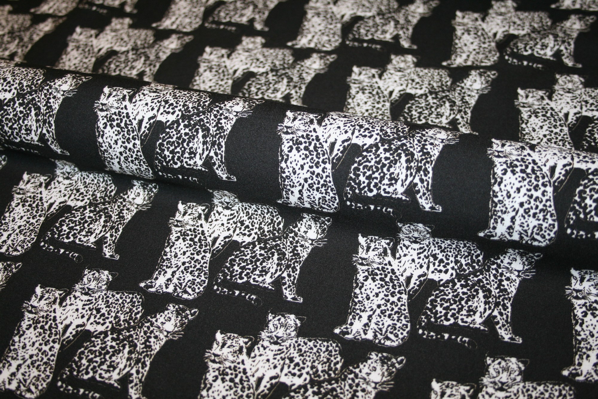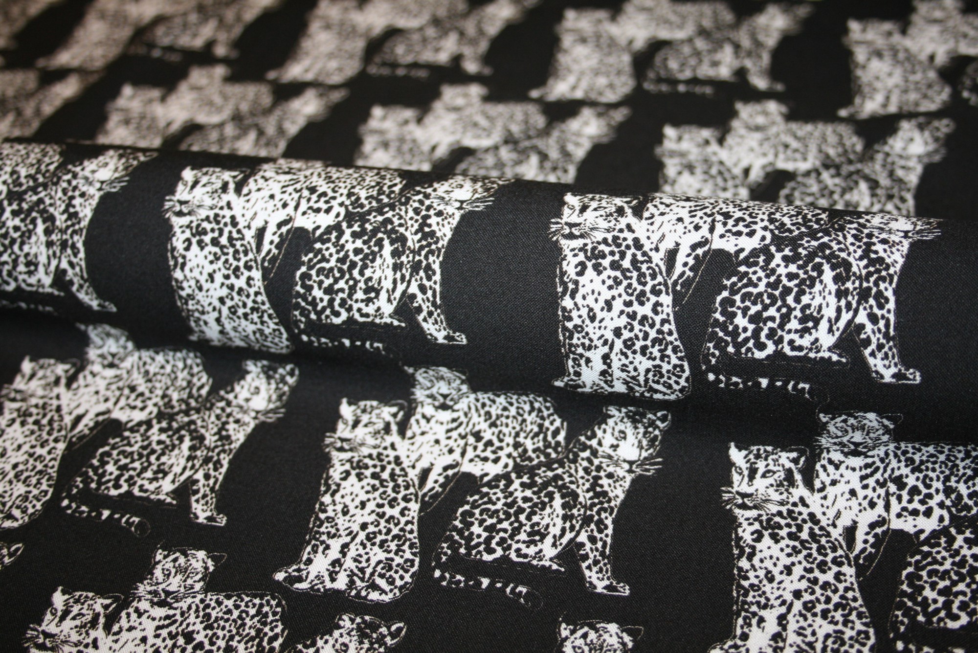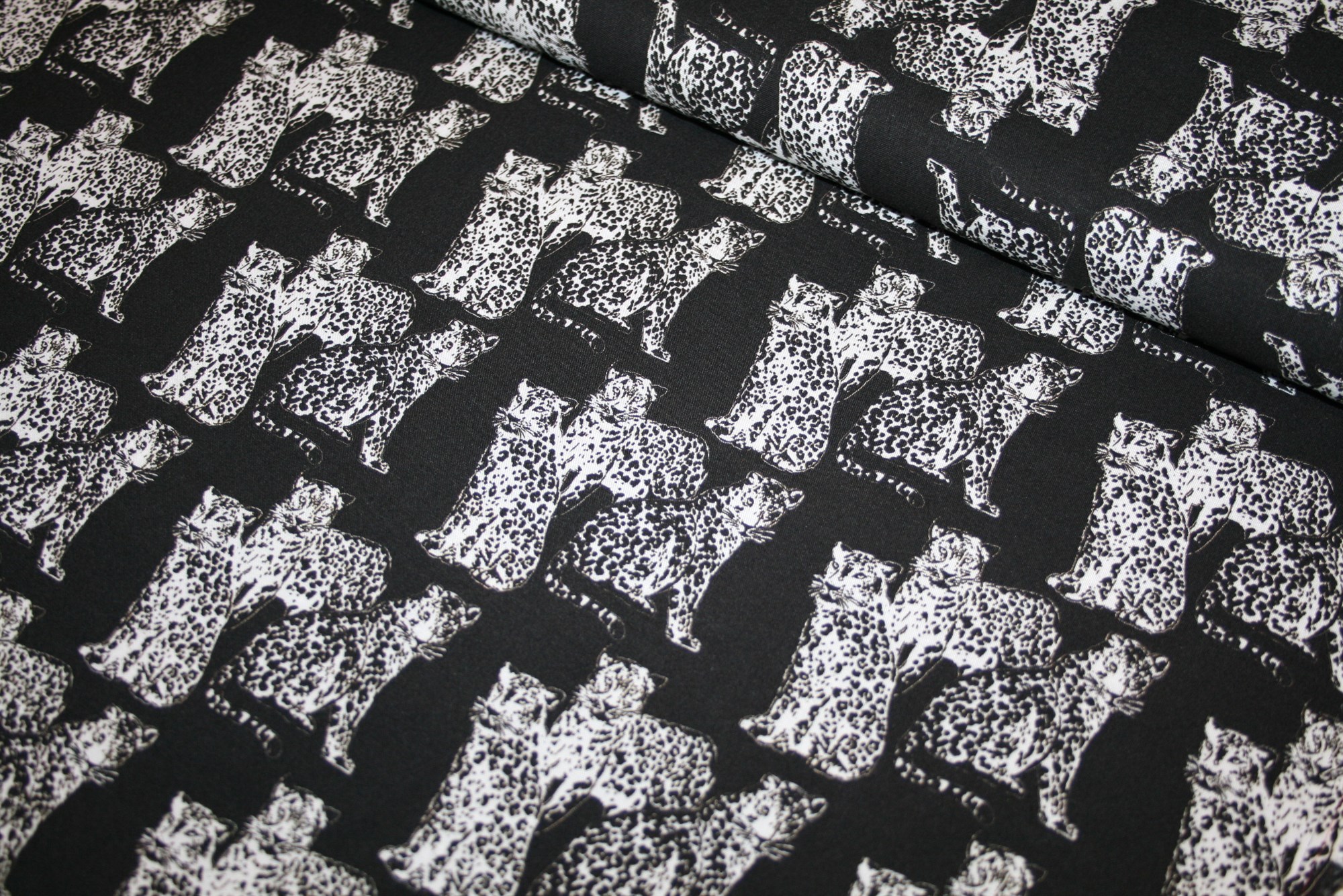 Blød og fastvævet viscose med hvide tigre på en sort bund. Stoffet er oeko-tex certificeret, dvs. uden skadelig kemi.