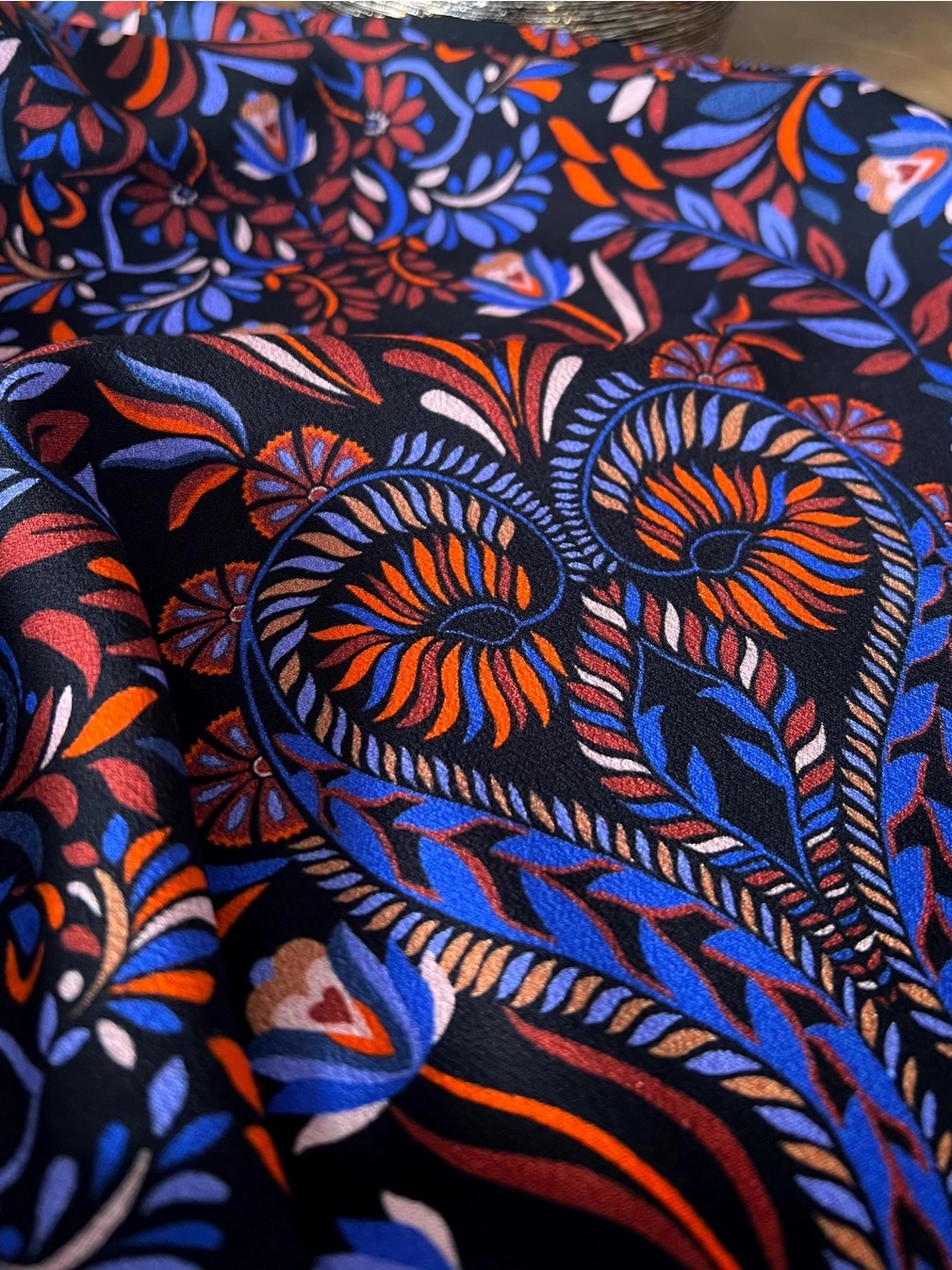 Viskose crepe med botanisk og etnisk inspireret print i en smuk farvekombination. Kvaliteten er fastvævet og blød.