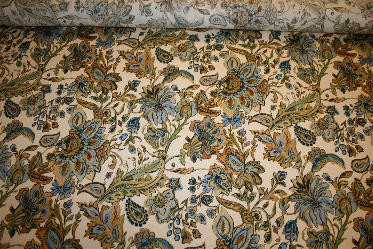 Et karakterfuldt og levende hørstof med et rigt og detaljeret print bestående af blomster, slyngende ranker og paisley-inspirerede elementer i nuancer af mosgrøn, brun og blå på en creme bund.