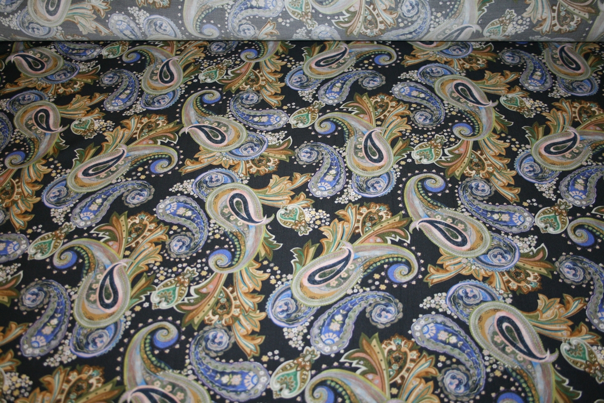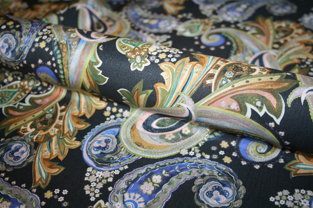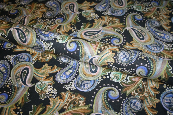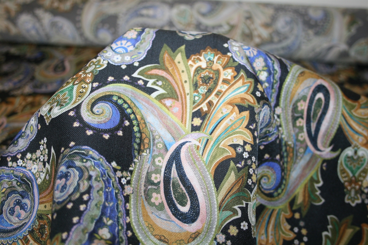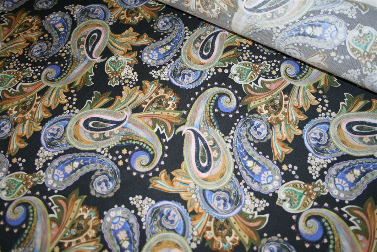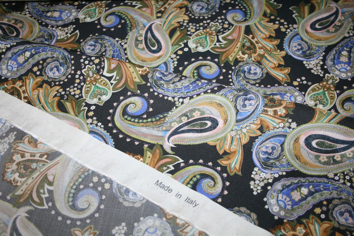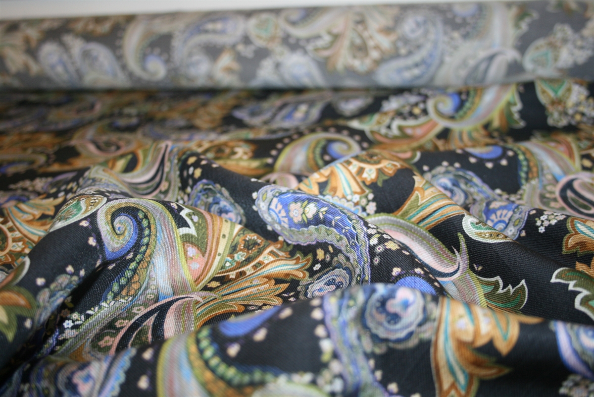 Twillvævet silke -og viscoseblanding med sjalsmønster i smukke toner. Kvaliteten er let og lækker. Stoffet er produceret for Etro (deadstock).