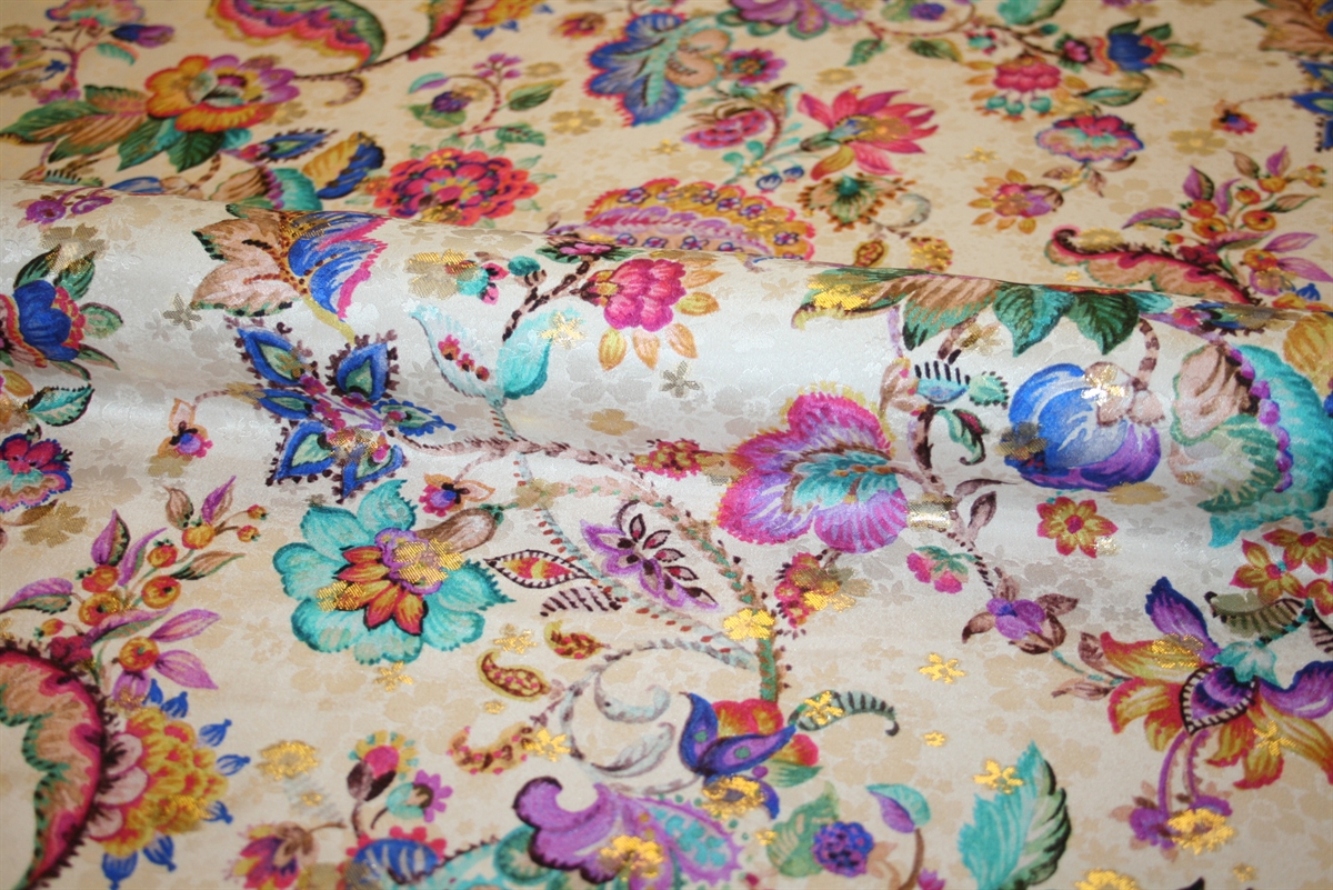 100% silke i en blomstret jacquardvævning med guldlurex og paisley print på en sandfarvet bund. Stoffet er produceret for Etro.