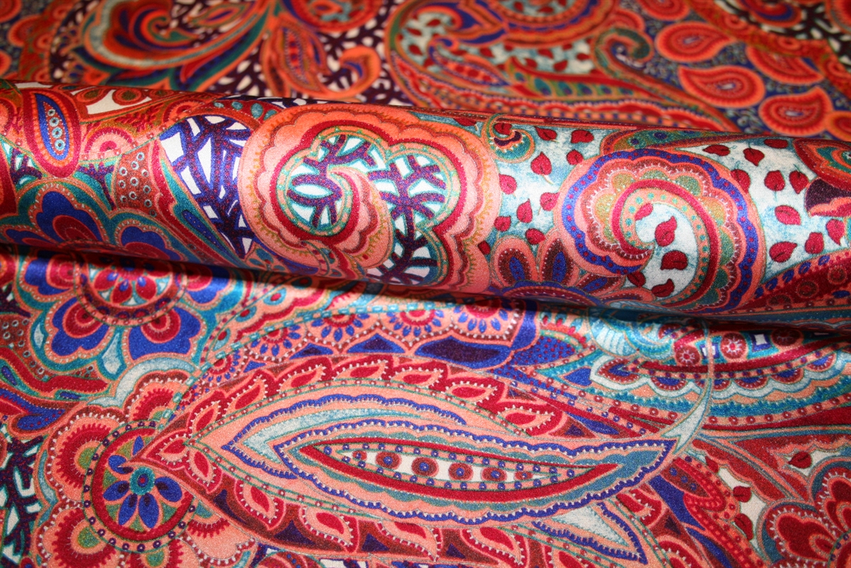 Blød silkesatin med et smukt fald, tværstræk og paisley print i varme nuancer. Stoffet er produceret for Etro.