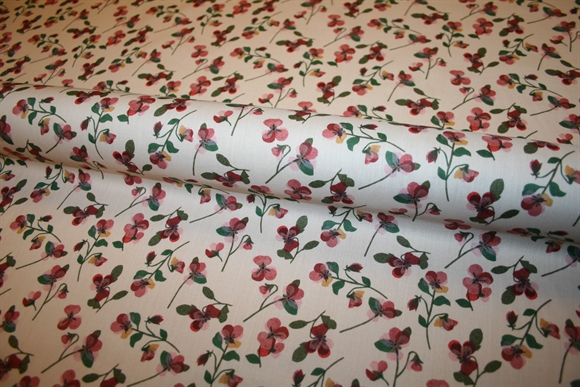 Liberty Tana Lawn™ i 100% bomuld med små spredte stedmoderblomster i nuancer af bordeaux, lyserød, okker og grøn på en blød sandfarvet bundtone.