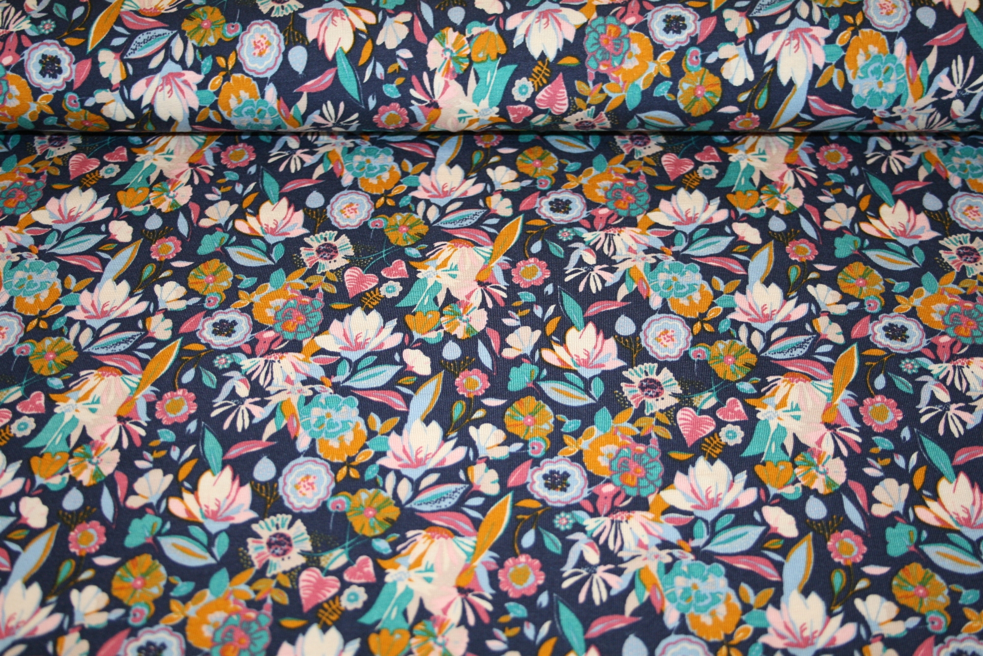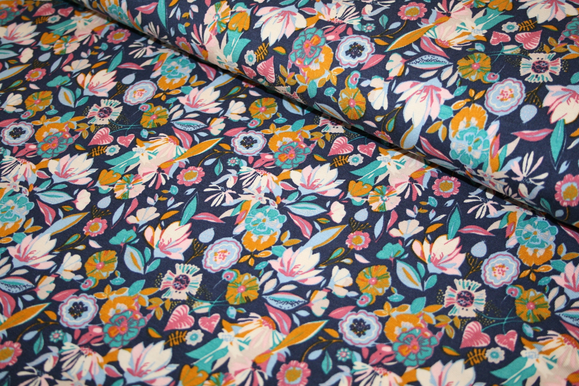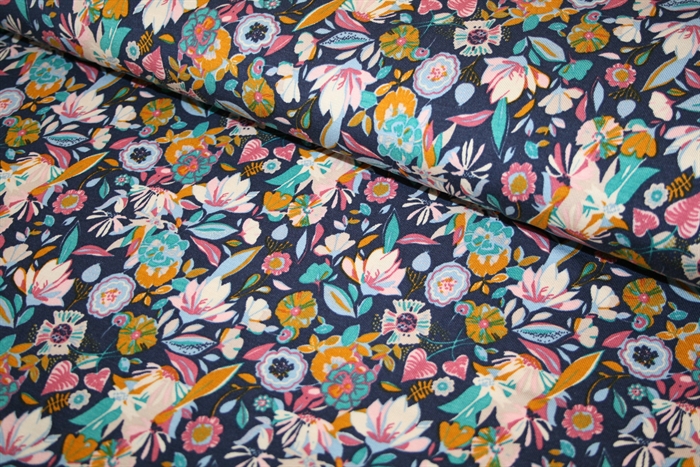 Blød tencel modal jersey med blomster på en navy bund. Stoffet er oeko-tex certificeret, dvs. uden skadelig kemi.
