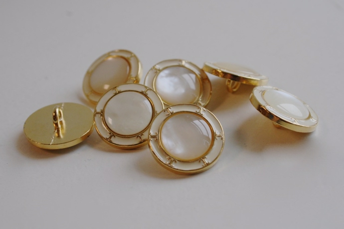 Råhvid emalje øjeknap i guldramme.
