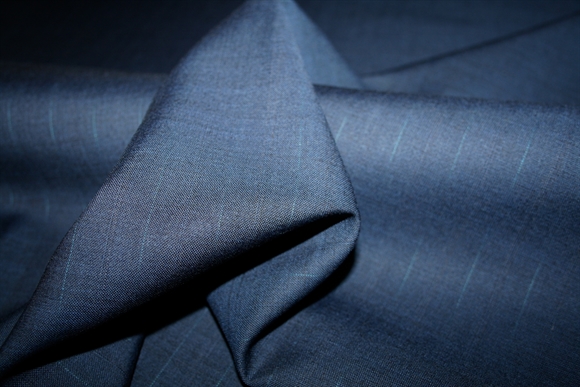 100% uld i en let og lækker italiensk vævning med tynde lodrette turkis nålestriber på en navy bund.