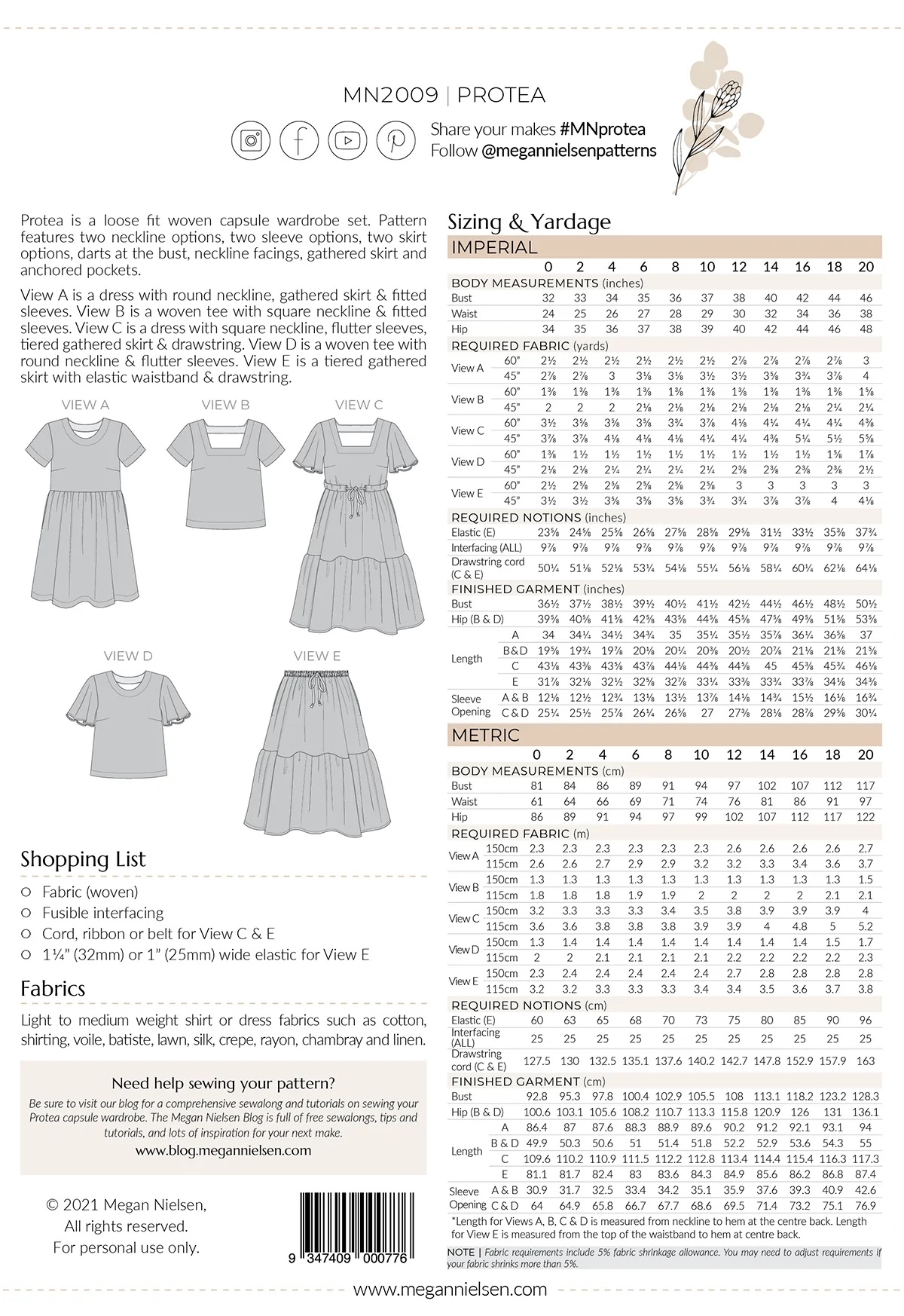 "Protea is a loose-fit woven capsule wardrobe set. The pattern features two neckline options, two sleeve options, two skirt options, darts at the bust, neckline facings, a gathered skirt and anchored pockets.