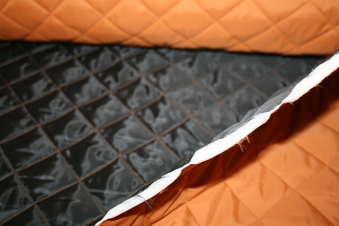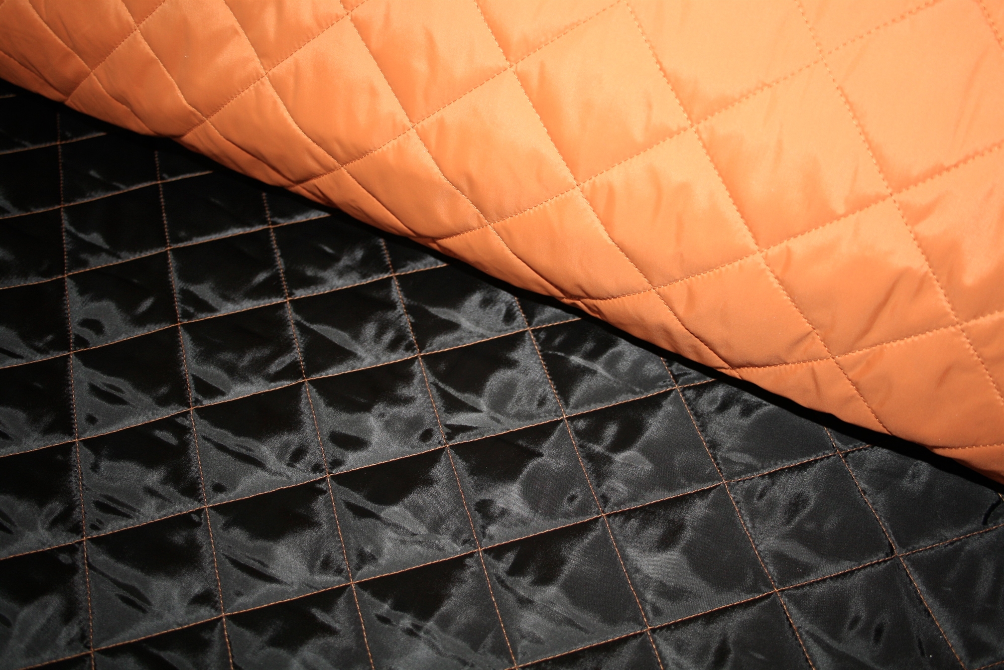 Lækker medium kraftigt vatteret stof. Stoffet er terracotta på den ene side og sort på den anden. Stoffet er quiltet i kvadrater.
