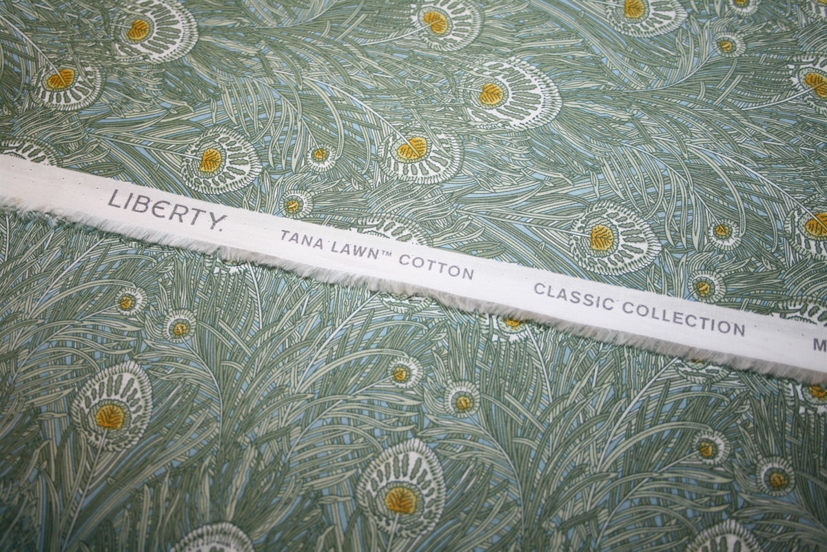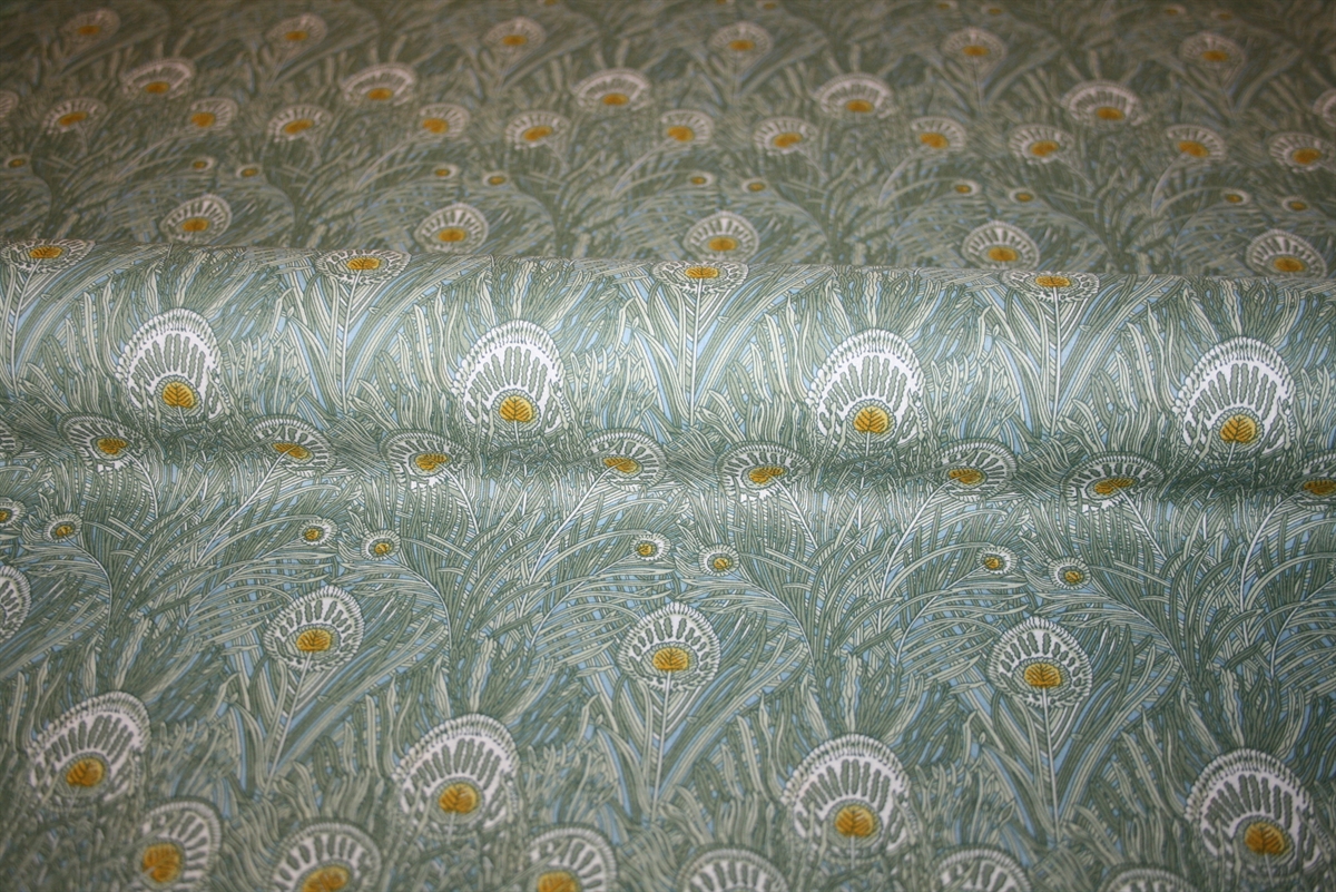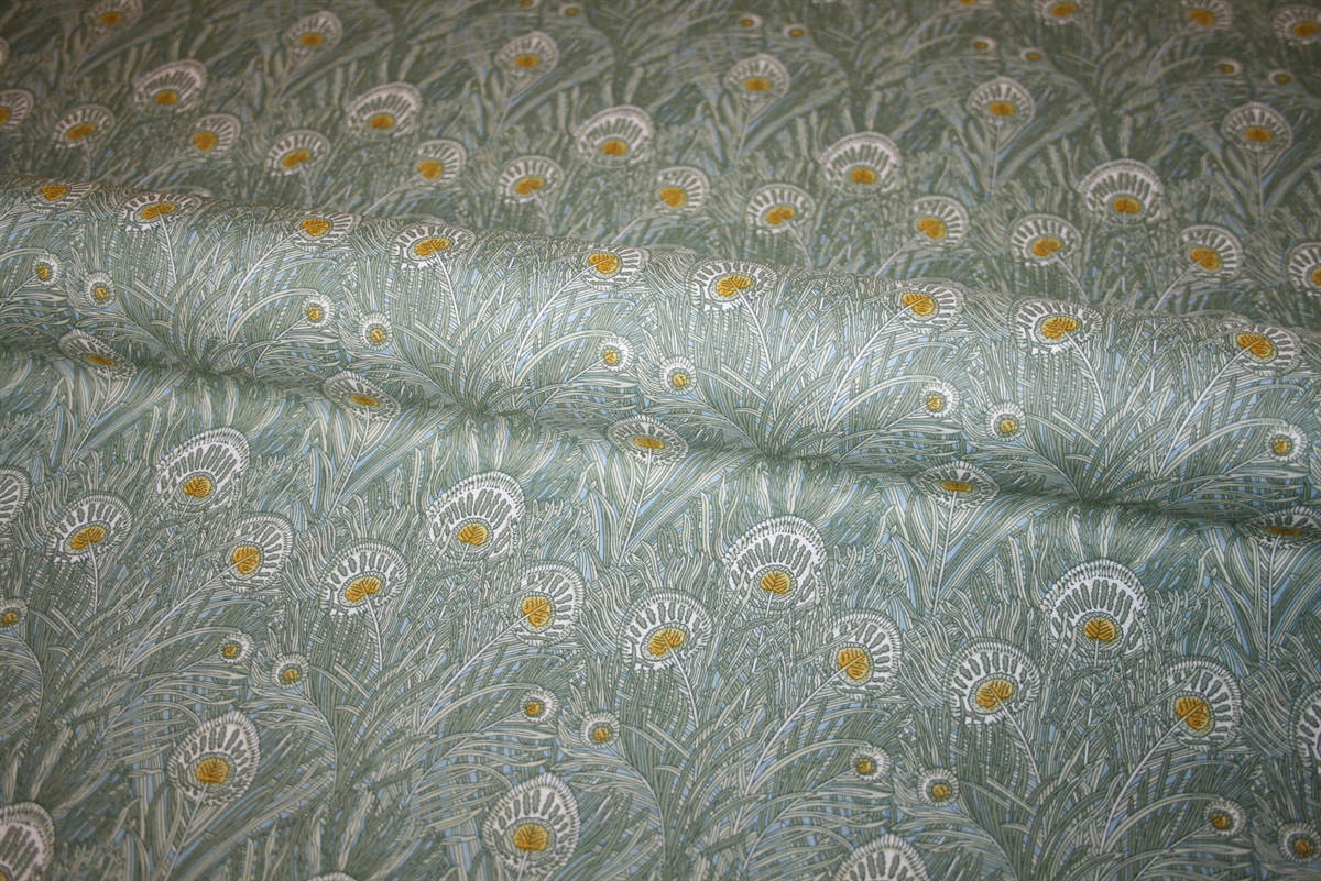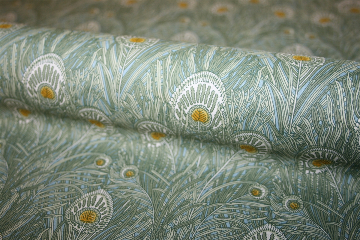 Liberty Tana Lawn™ i 100% bomuld med print af påfuglefjer i en grøn, lyseblå og gul farvepalette. Stoffet er oeko-tex certificeret, dvs. uden skadelig kemi.