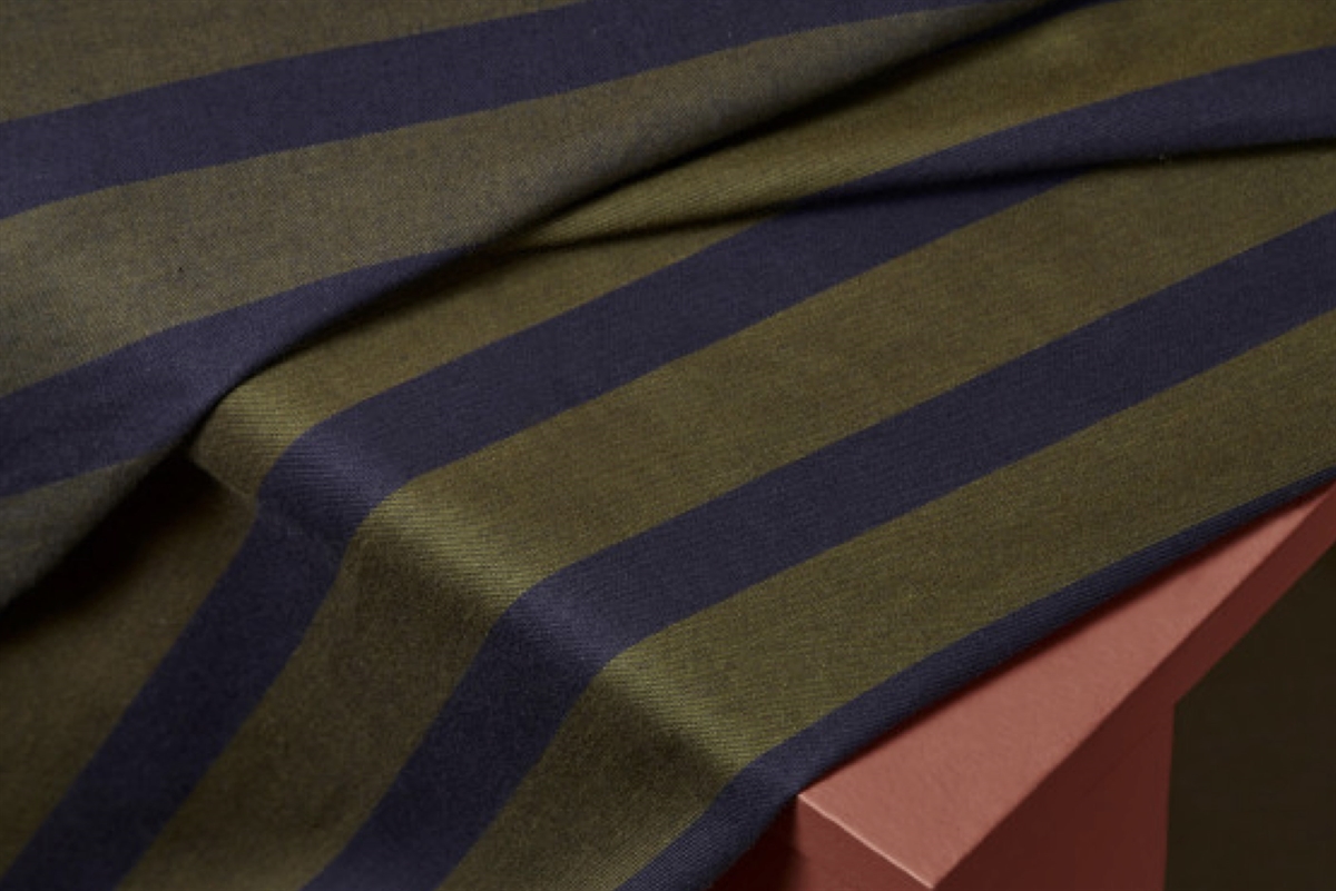 Lækker bomuld med lidt bredere lodrette striber (hhv. 28 og 18 mm.). Kvaliteten er let-medium kraftig. Stoffet er oeko-tex certificeret.