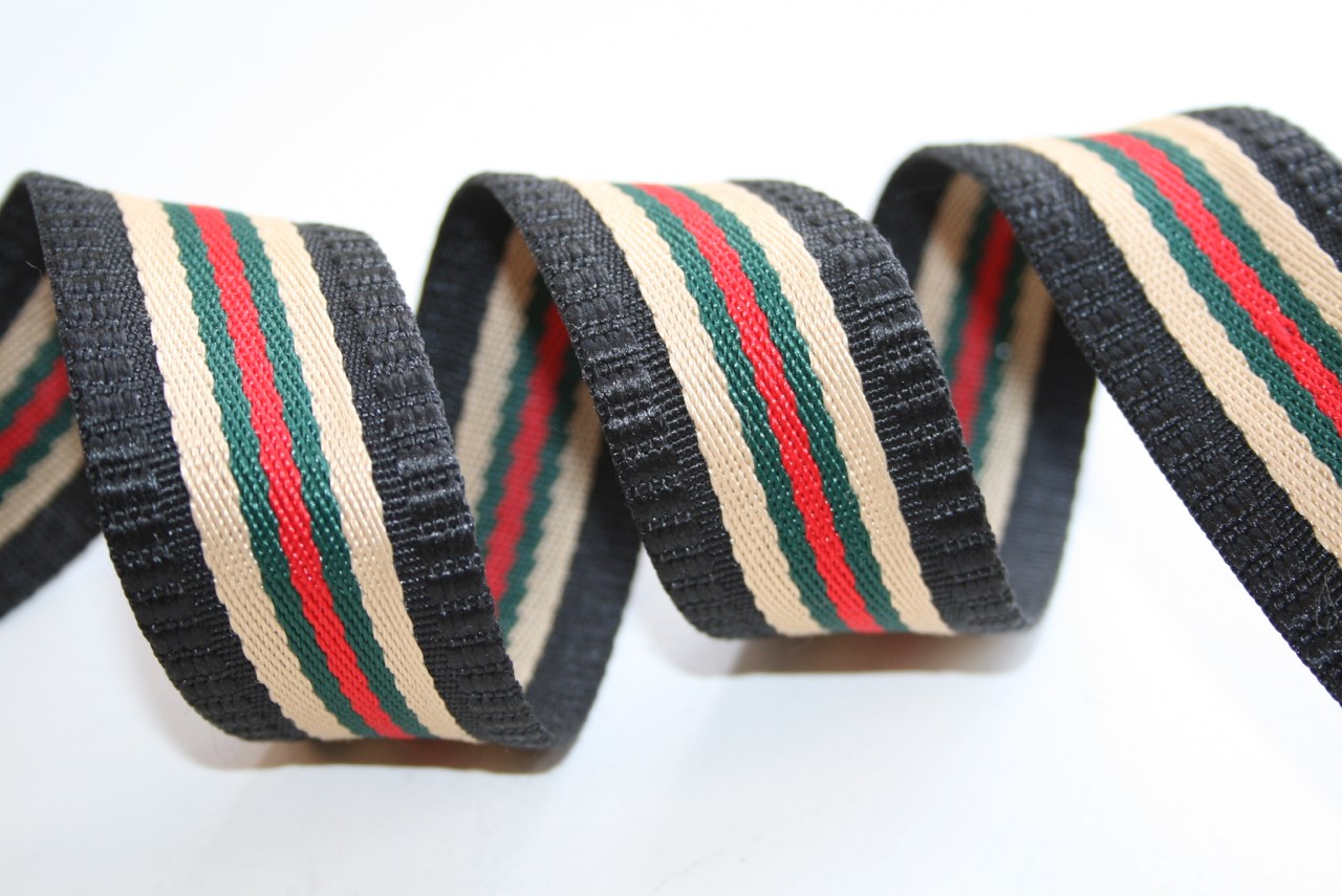 Vævet grosgrainbånd med striber i sort, grøn, sand og rød. Båndet er 3 cm. bredt og kvaliteten er lidt kraftigere.