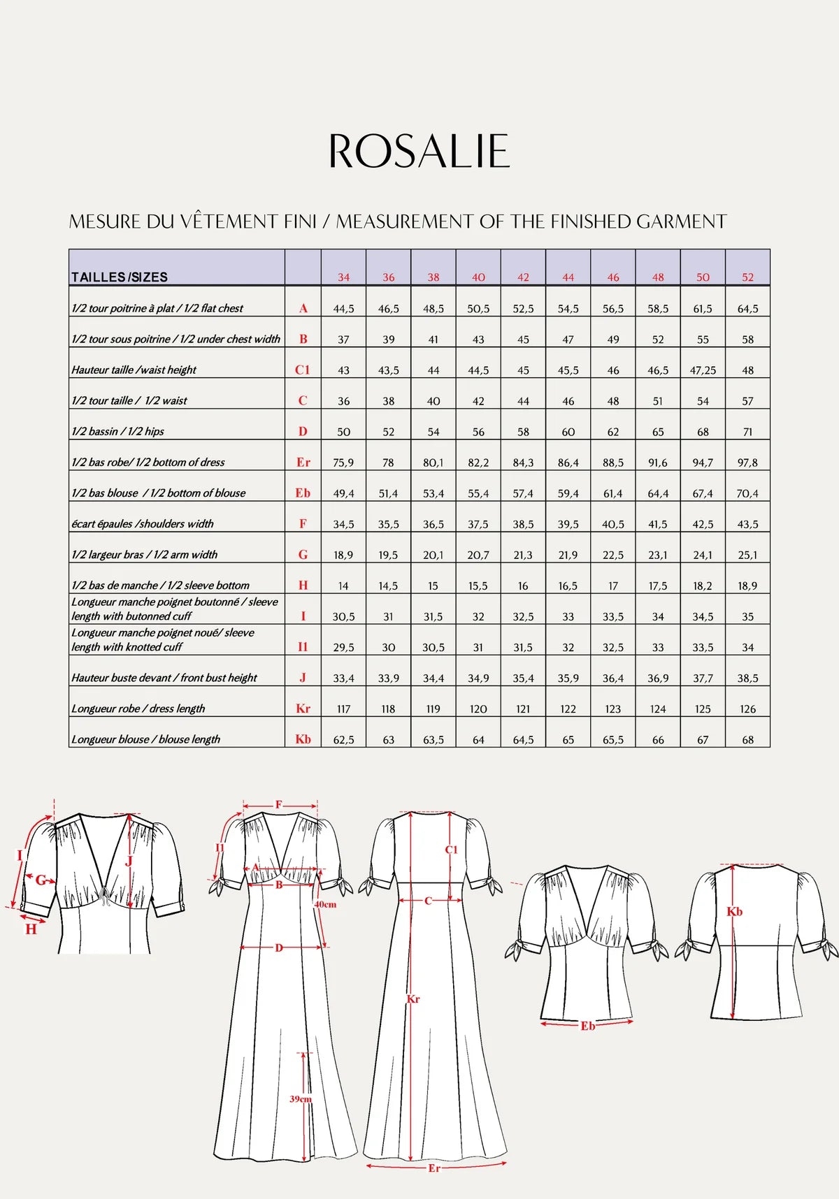 Rosalie er en feminin kjole med en dyb v-udskæring – designet så den er flatterende uden at afsløre for meget. Mønstret giver dig to forskellige afslutninger på ærmerne: bindebånd for et romantisk udtryk eller manchet med knaplukning for et mere struktureret look. Og som en ekstra bonus kan Rosalie også sys som en bluse – helt perfekt til sommergarderoben.