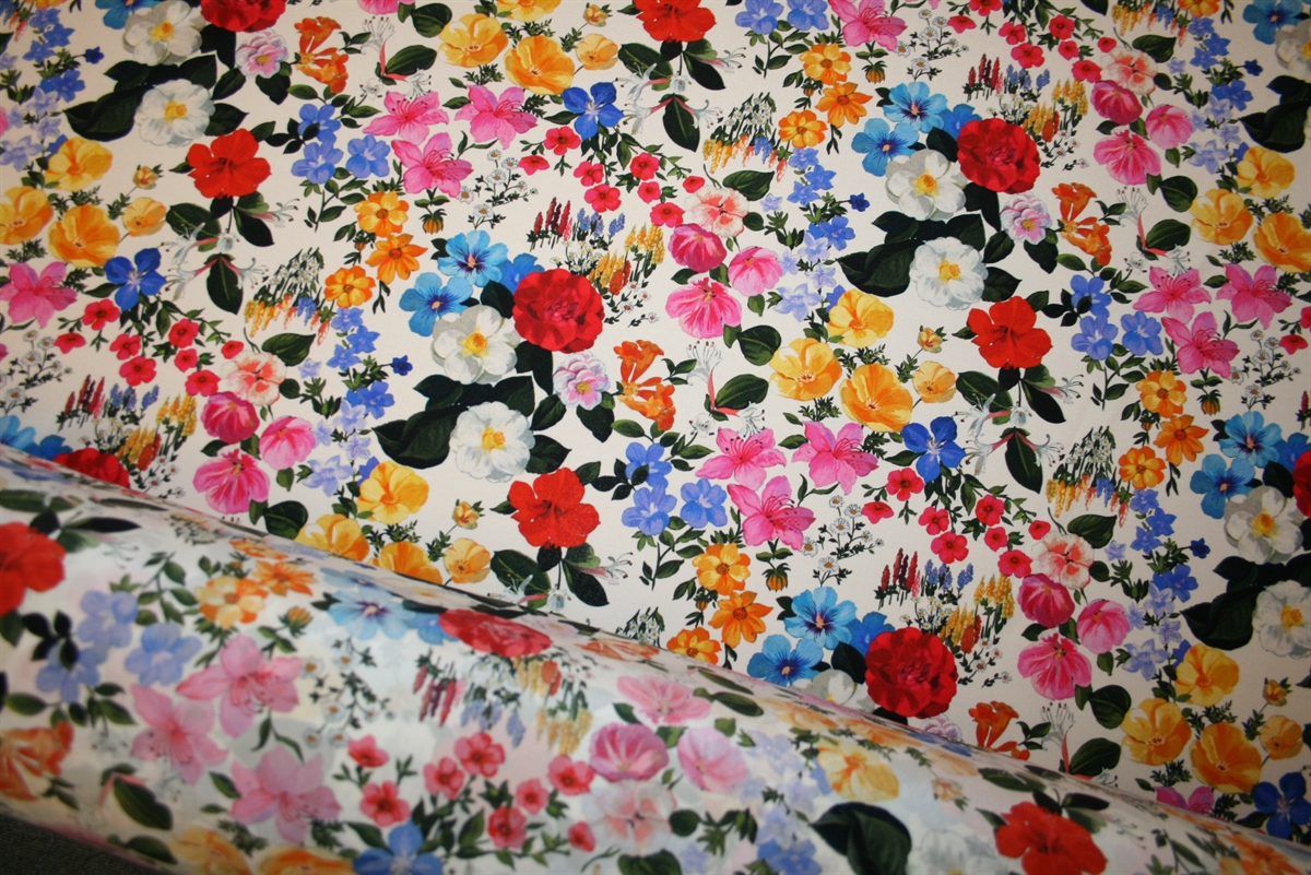 100% silke crepe de chine med et farverigt blomsterprint på en hvid bund. Stoffet er produceret for Blumarine.