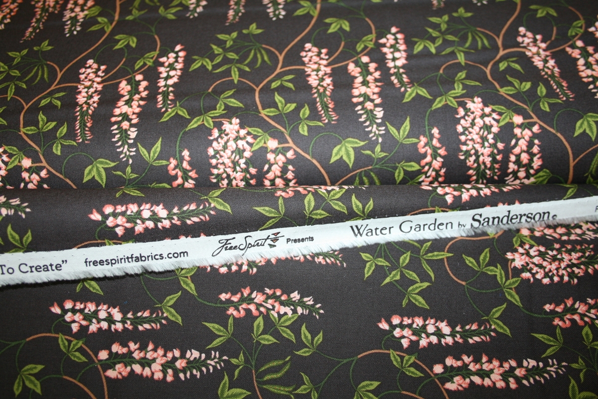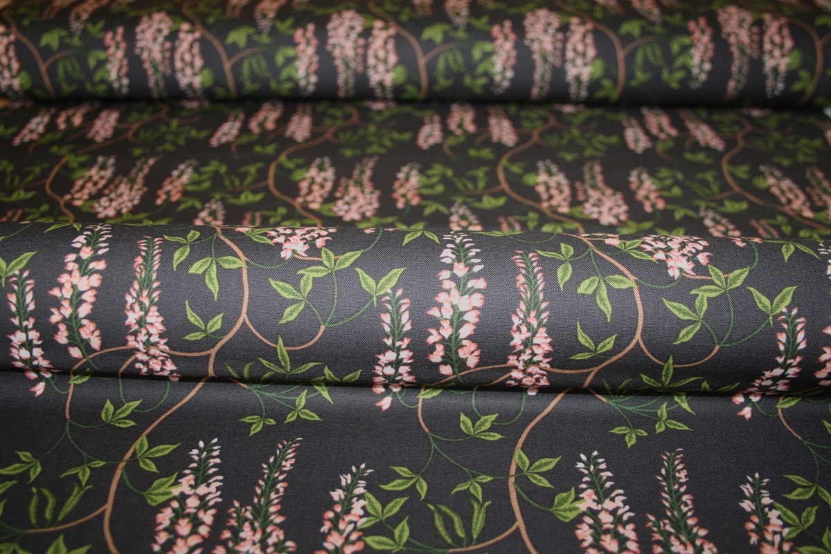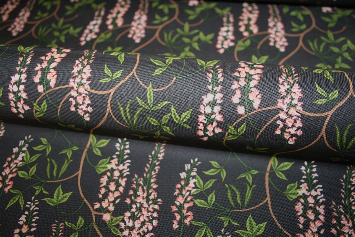 100% bomuld med Sanderson print af blomsterranker på en brunsort bund. Kvaliteten er fastvævet og medium kraftig.