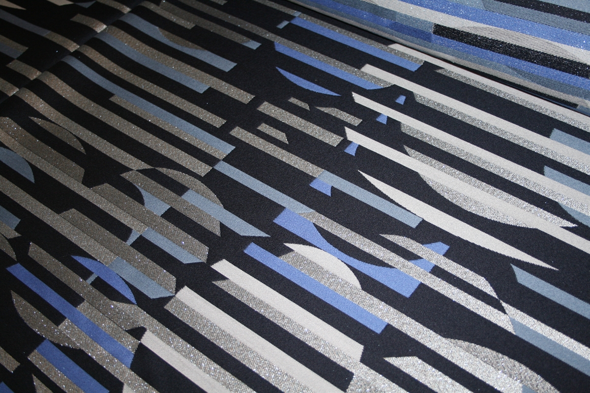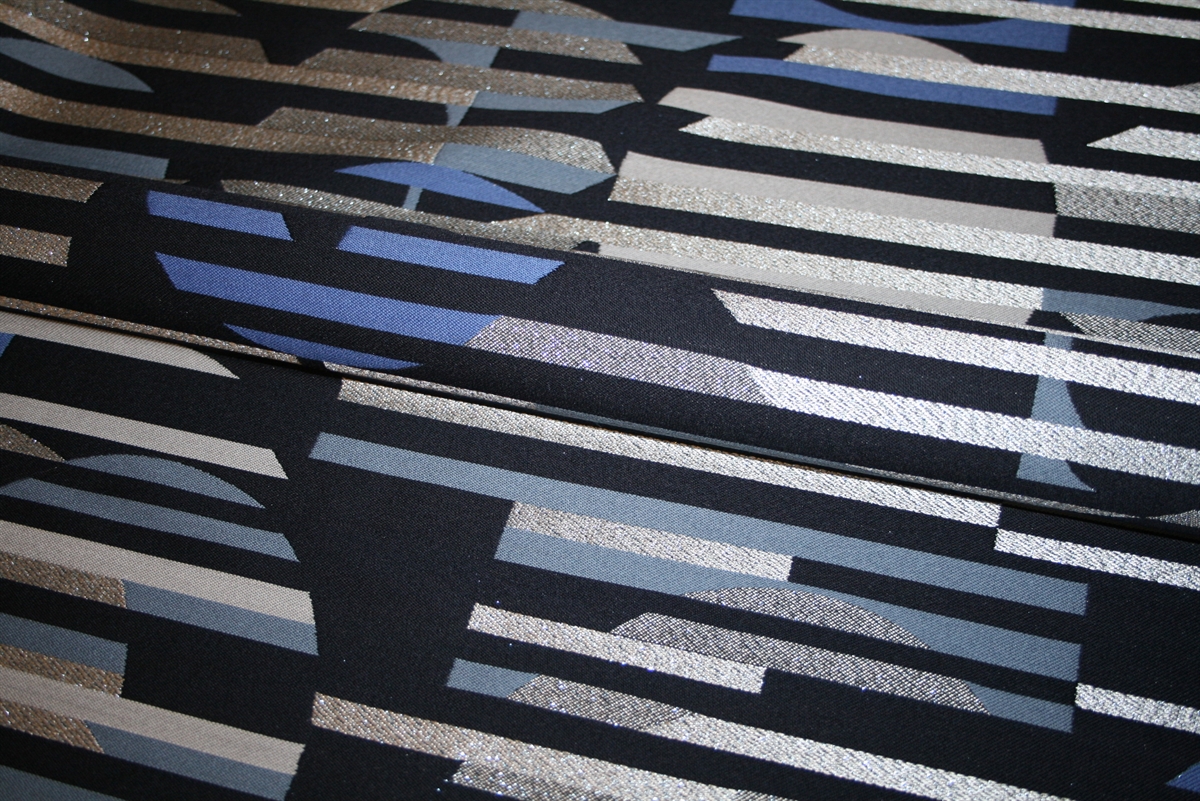 Skøn italiensk jacquard med vandrette striber og cirkler med skinnende sølvtråde. Kvaliteten er medium kraftig og forholdsvis blød.