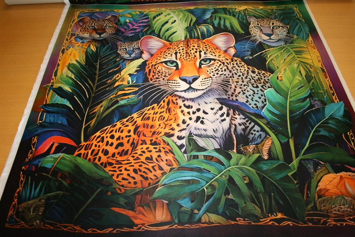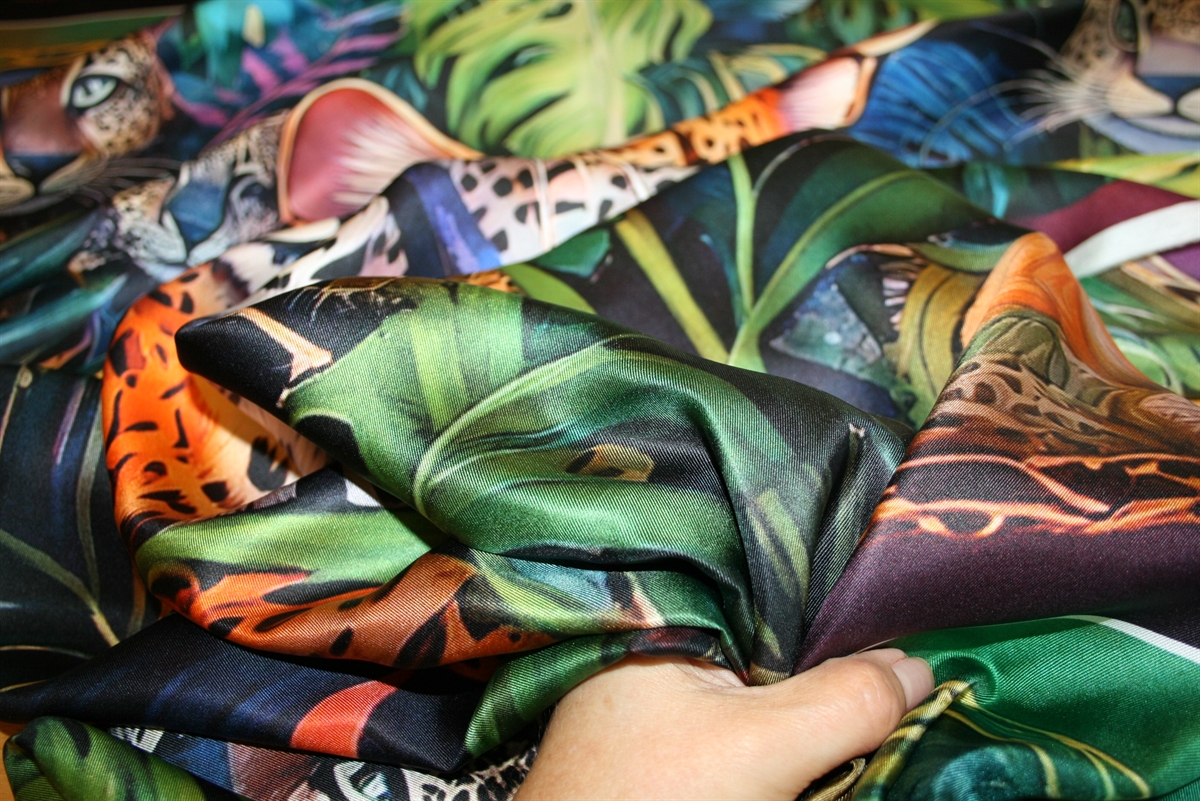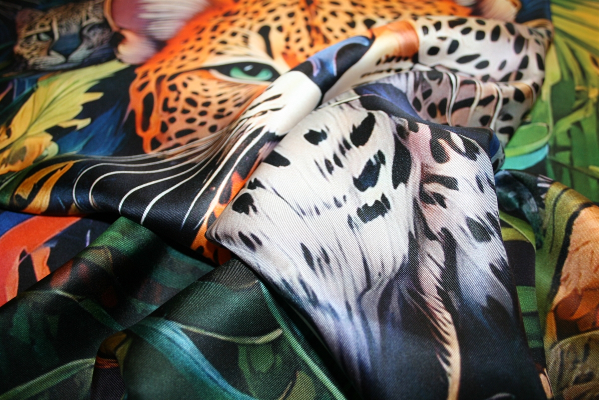 Twillvævet silke til tørklæde. På stoffet er et farvestrålende tropisk print med dyr. Silken er produceret for Ferragamo. Stykket måler ca. B91*H92 cm.