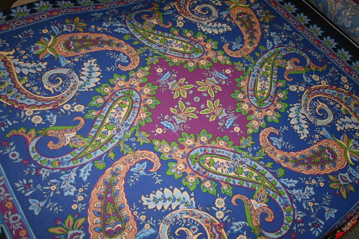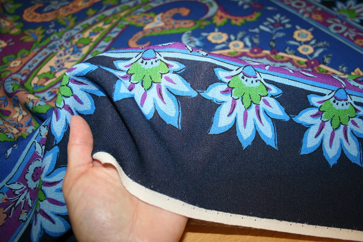 Let og luftig uld -og silkeblanding til tørklæde. På stoffet er et større paisley print i klare farver omkranset af en navy bort. Stoffet er produceret for Etro. Stykket måler ca. B130*H140 cm.