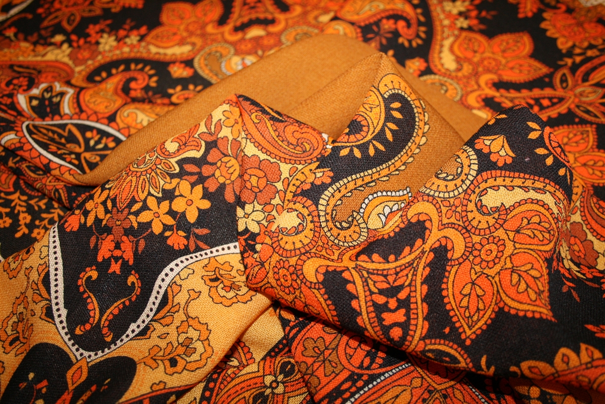 Mønstret er et ornamenteret paisley- og blomsterdesign med et elegant, næsten barokt udtryk. De detaljerede former og symmetriske rammer giver stoffet et eksklusivt og tidløst look, der minder om vintage-tørklæder fra 60’erne og 70’erne fra ikoniske modehuse.