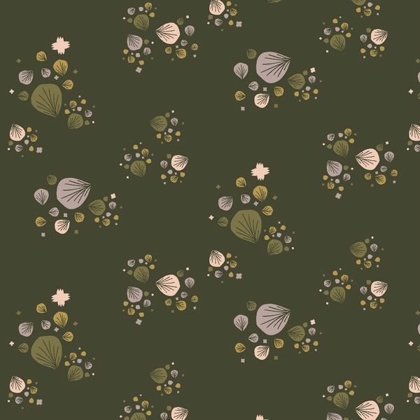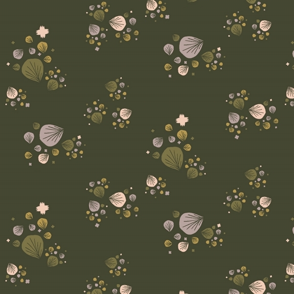 Det mørke, jordgrønne bundfarve giver stoffet en dyb og næsten skovbunds-agtig stemning. På den ligger små, spredte klynger af stiliserede blade og frø i afdæmpede nuancer af støvet rosa, sand, oliven og gyldne toner.