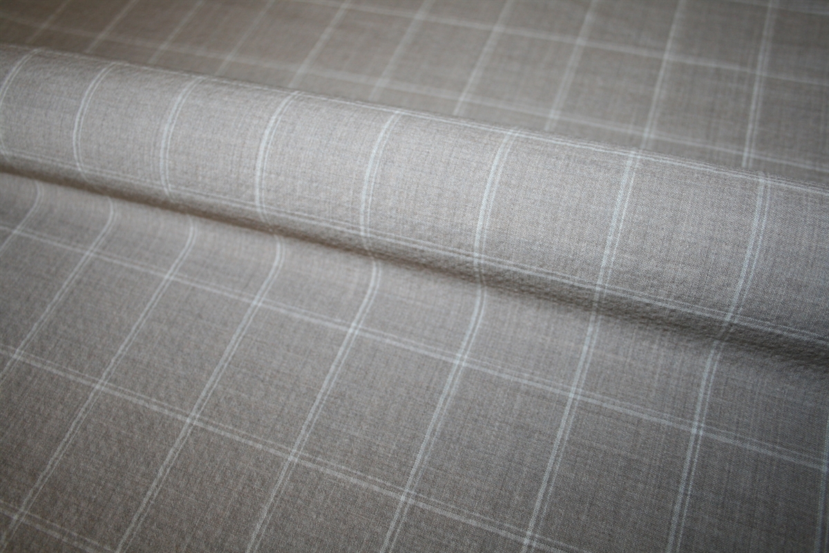 Beige seersucker uldstretch med tern. Kvaliteten er let og lækker. Stoffet er produceret i Italien.