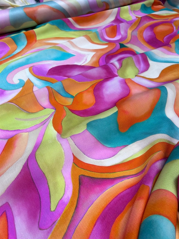 Let strukturvævet silke med et større retro-inspireret print i sommerfarver. Stoffet er produceret for et internationelt modehus.