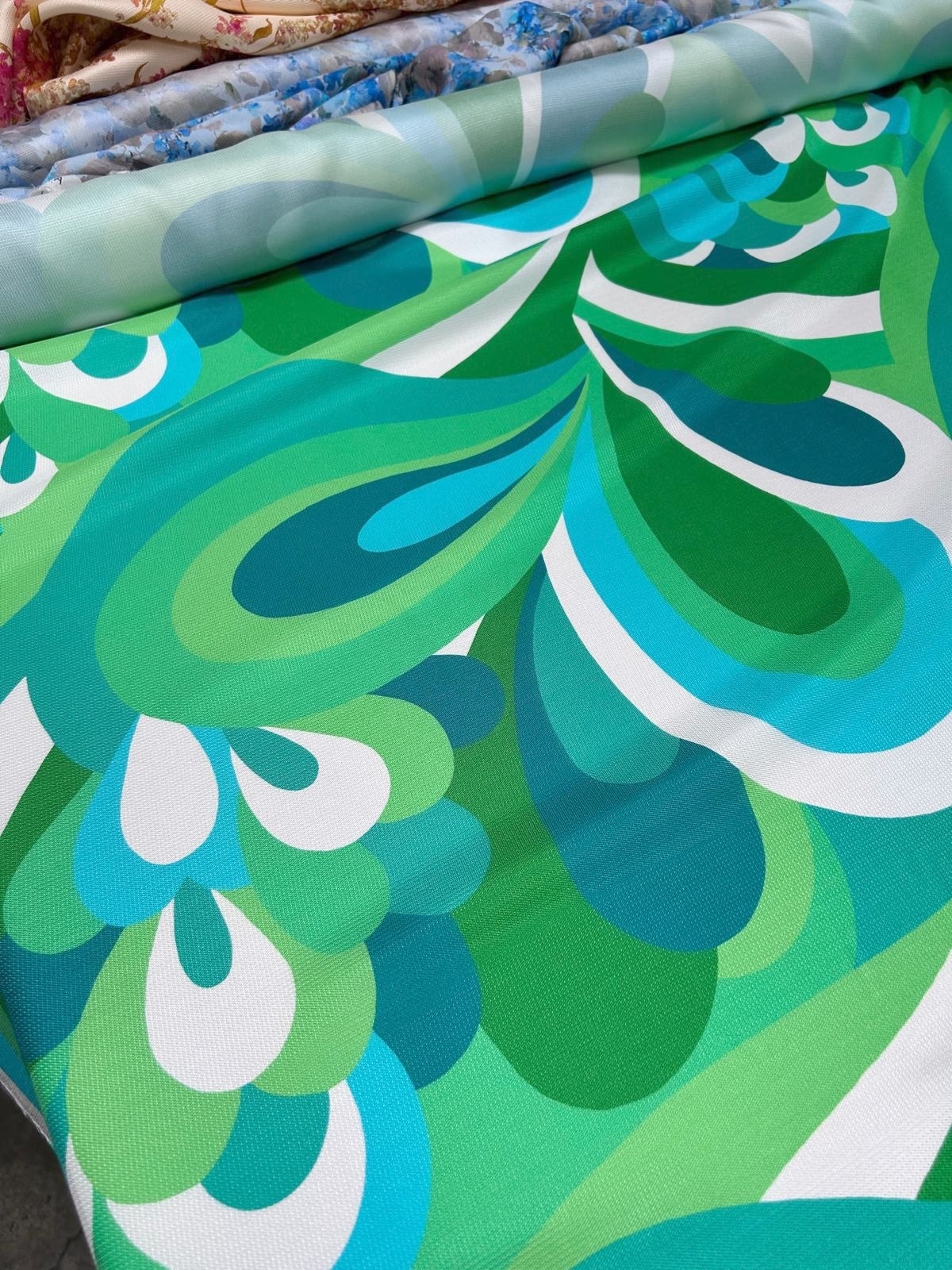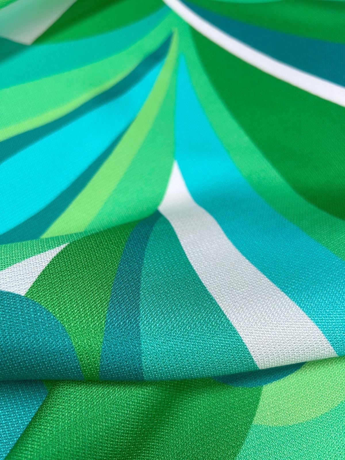 Silkestof med et stort grafisk retro-inspireret print. Stoffet har et levende mønster i grønne, turkis, petrol og hvide toner, som giver et moderne og samtidig vintage-inspireret look. Silken har en let struktur med en naturlig glans, som giver en eksklusiv finish.