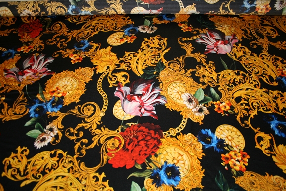 Silkesatin med et farvestrålende print i klare farver. Mønsteret gentages for hver ca. 60 cm. Stoffet er produceret for Versace.