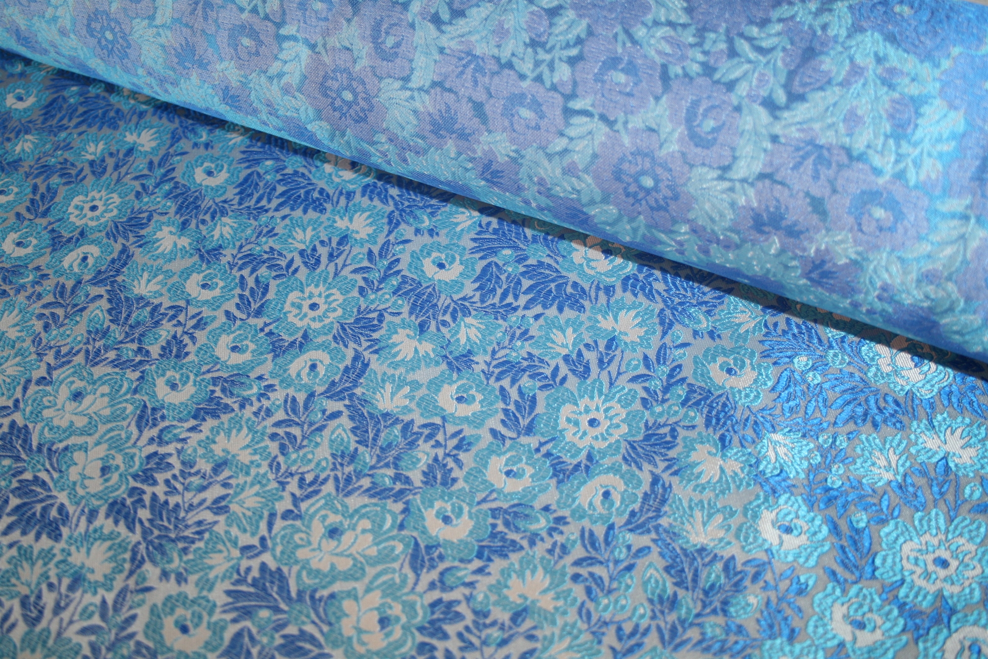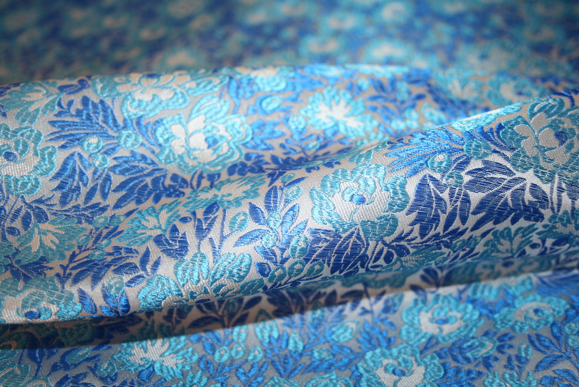 Fastvævet jacquard med silke og skinnende blå blomster på en lys bund. Kvaliteten er lettere og bærer sig selv.