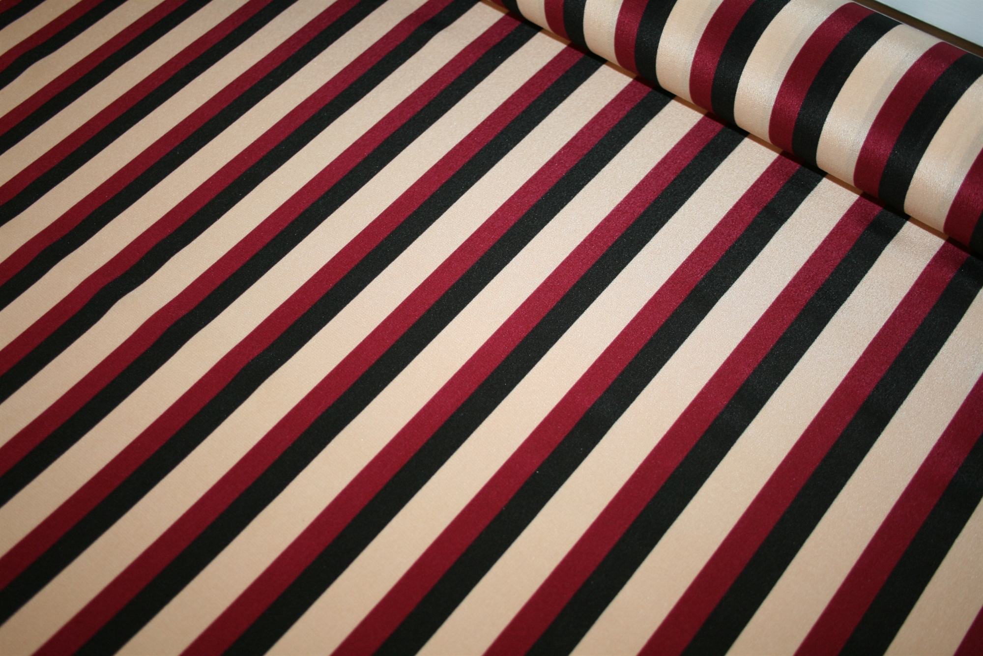 100% silke crepe de chine med lodrette striber i sand, sort og bordeaux. Striberne er henholdsvis 12 og 18 mm. brede. Stoffet er produceret for Prada.
