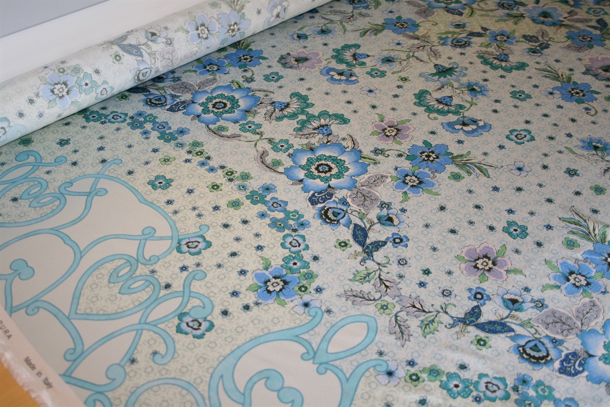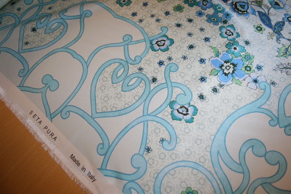 Silkesatin med et meget smukt blomstprint. Silken har en bort langs den ene ægkant