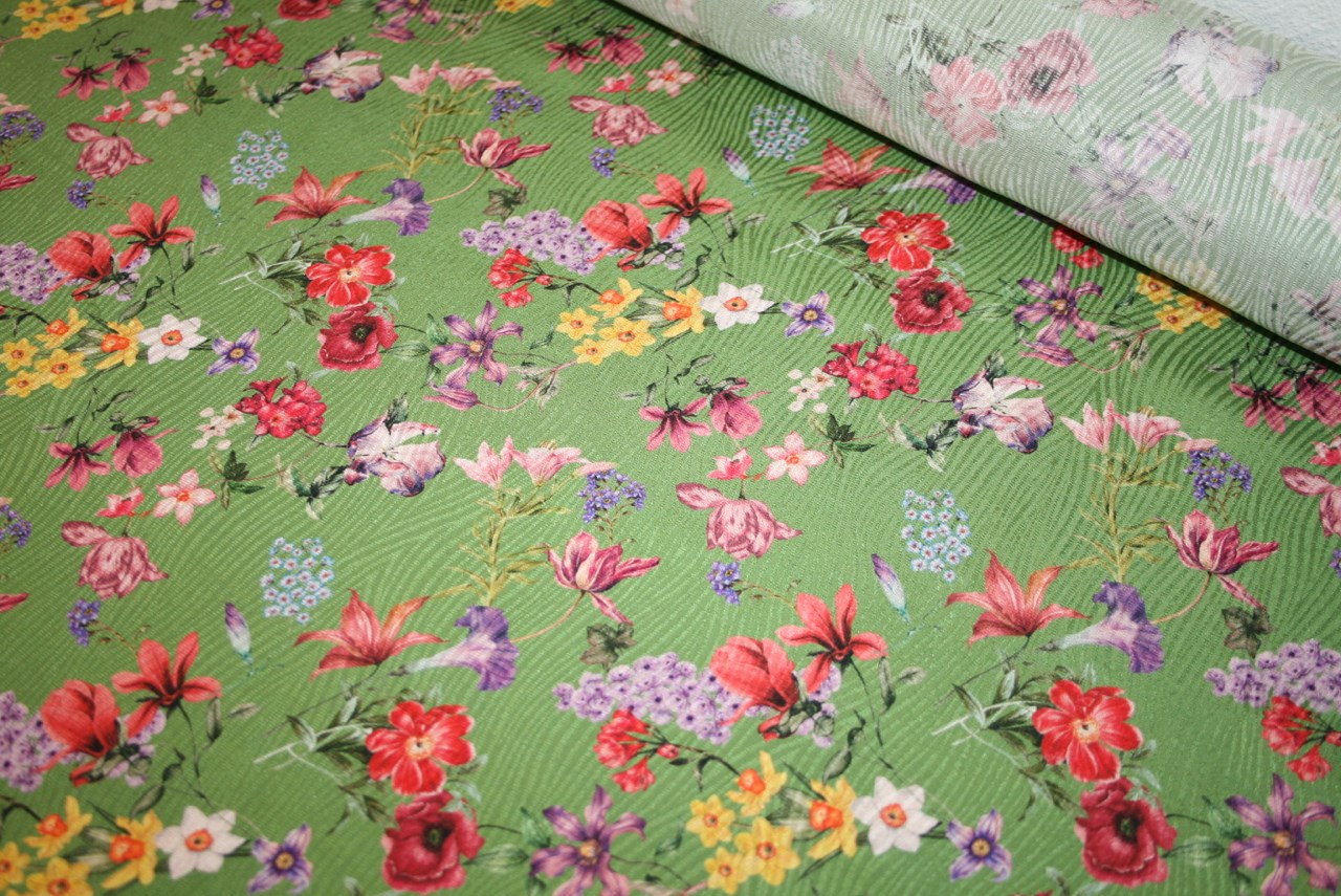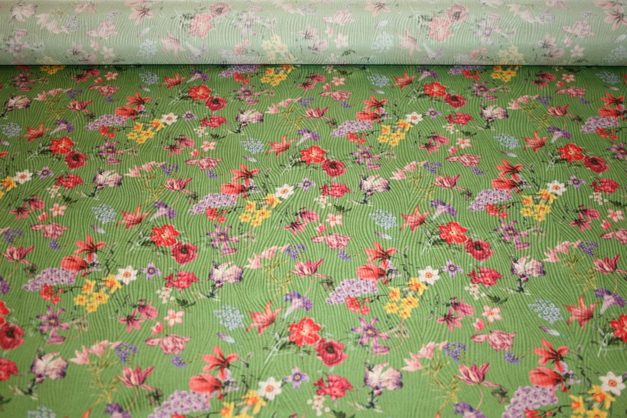 Jacquardvævet deadstock silke med små blomster på en græsgrøn bund. Silken er produceret for Blumarine.