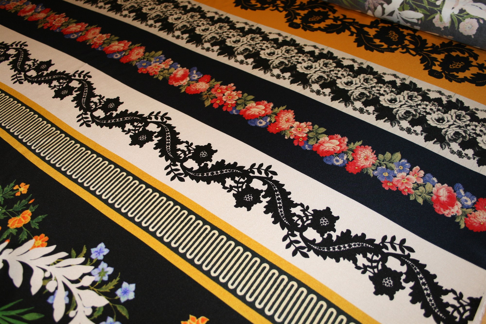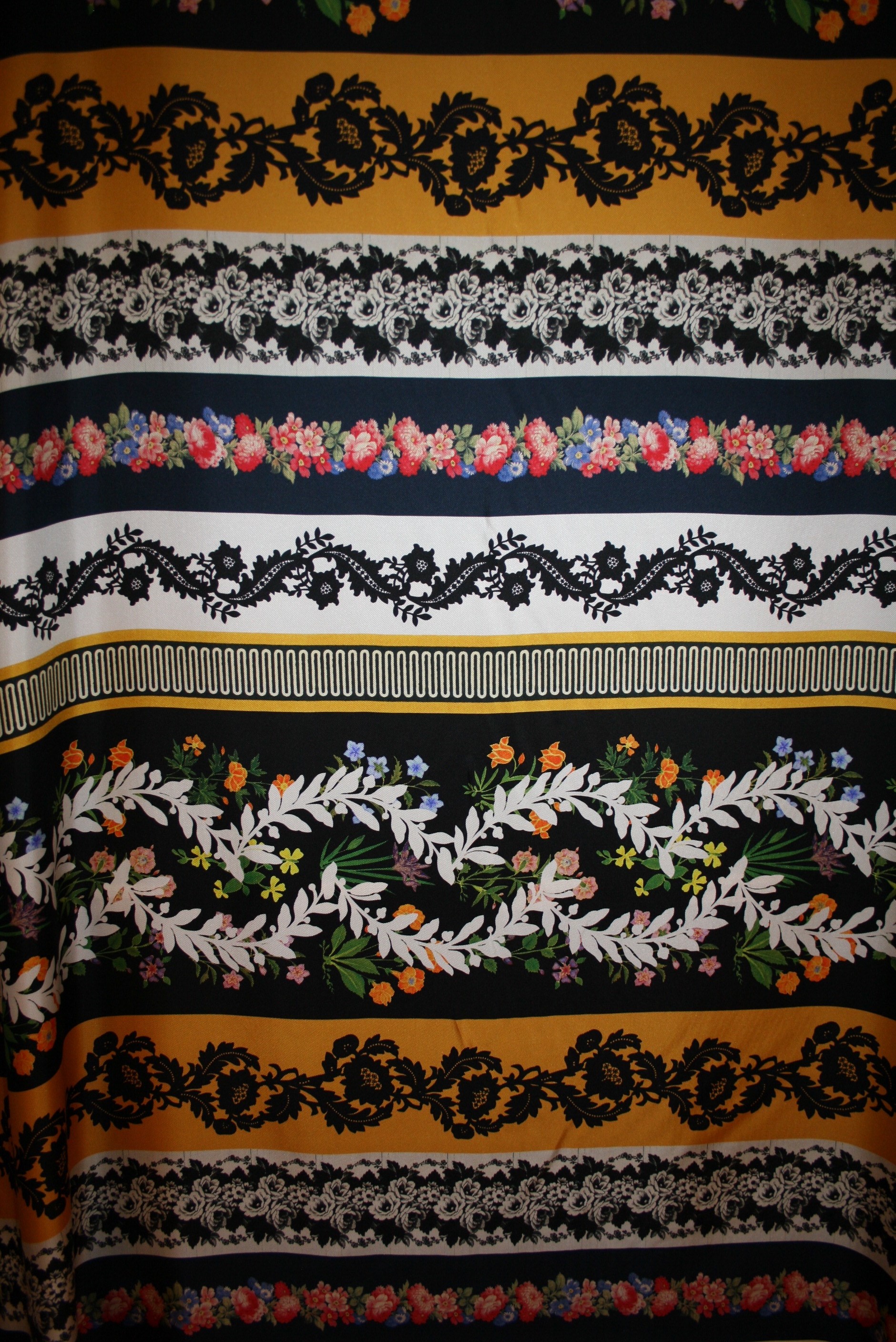 Eksklusiv twillvævet deadstock silke med vandrette borter. Kvaliteten er let og blød. Silken er produceret for Oscar de la Renta. Bemærk at stoffet kommer i rapporter.