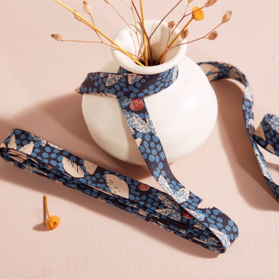 Crepevævet viscose skråbånd til kantafslutninger. Skråbåndet er 1 cm. bredt.