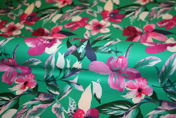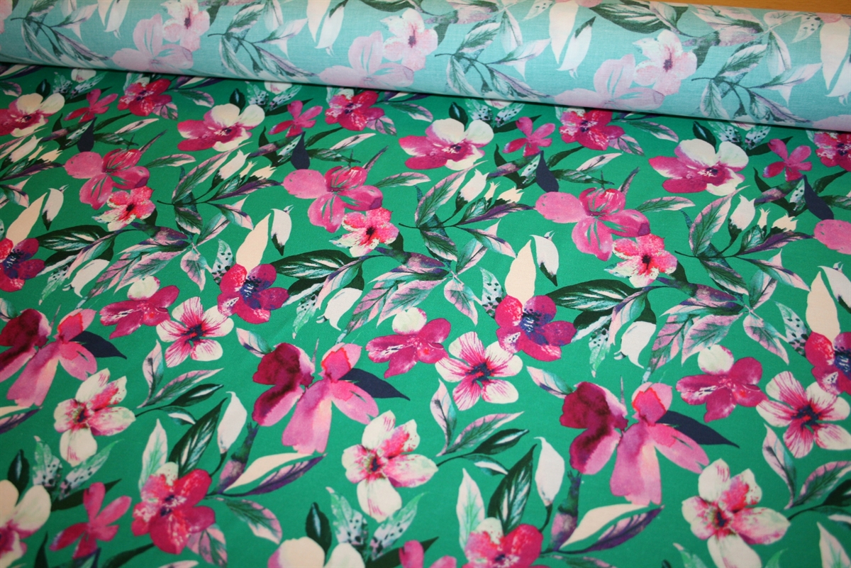 Twillvævet bomulds stof med pink blomster på en græsgrøn bund