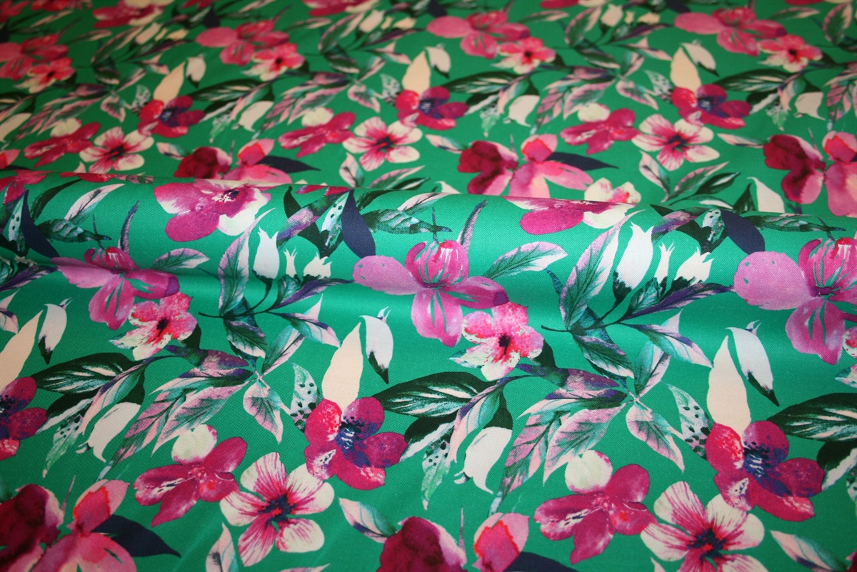Smørblød twillvævet bomuld med et smukt blomsterprint på en saftig grøn bund. Kvaliteten er let og giver sig en smule på tværs. Stoffet er produceret for Gai Mattiolo.