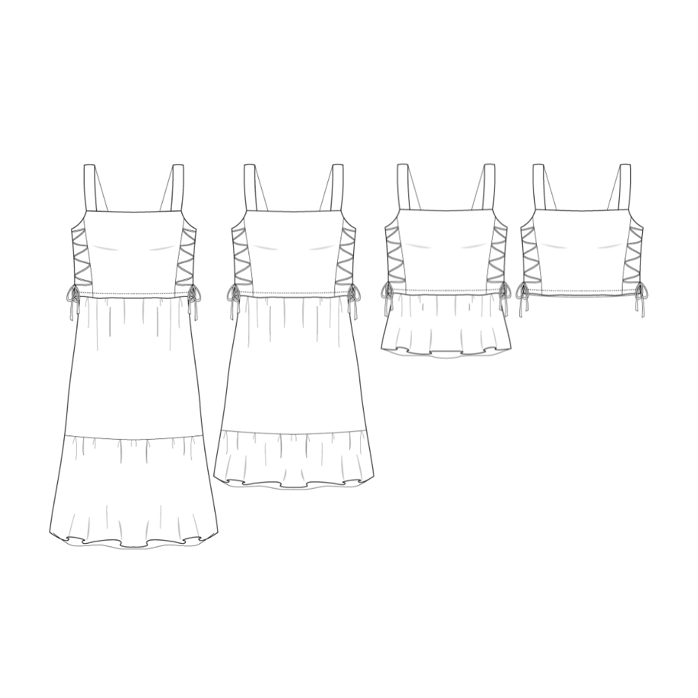 Symønster til kjole og top med firkantet halsudskæring, skulderstropper og snører i sidepanel.