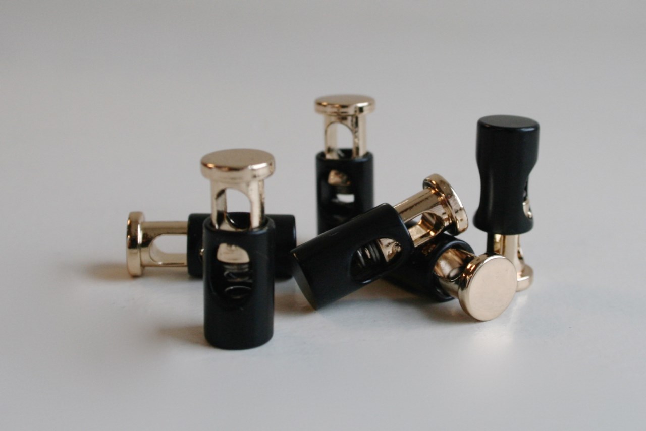 Guld/sort cylinderformet snorestopper i metal.